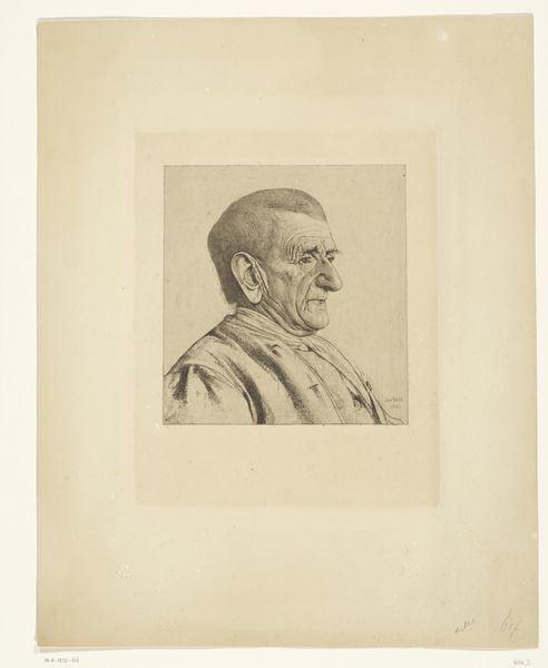 Editor: So, this is Alphonse Legros' "Portrait of Champfleury," a lithograph from 1875. The use of graphite on paper creates such a delicate, almost ghostly, image. What I immediately notice is how the single eyeglass makes you focus on Champfleury's gaze...What do you make of it? Curator: It’s a beautiful portrait, isn't it? To me, that delicate line work you mention suggests a certain intellectual fragility, like a thought barely captured before it flits away. The monocle, rather than being an affectation of wealth, strikes me as emphasizing Champfleury's focused vision—he was, after all, an art critic and novelist. How do you think Legros uses the negative space around the figure? Does it contribute to this feeling? Editor: Absolutely. There’s so much emptiness around him, it almost isolates him in his own world, his thoughts...almost floating, unconnected. So, you are suggesting that the bareness hints to something about his inner state. Curator: Exactly! This reminds me of the fleeting nature of fame and critical reception, always subject to change and reevaluation. In the portrait, Champfleury seems aware, maybe even a little weary, of this precariousness. A writer eternally bound to the whims of opinion! It gives it an unusual sensitivity for the period. It feels vulnerable. Don't you think? Editor: Yes, the loneliness of the intellectual... I hadn't really seen it that way. It’s a very pensive, intimate portrayal. So much is said in a few graphite lines. Curator: Which is part of the joy, isn’t it? To discover those whispers in the artist's work. I wonder what Legros and Champfleury were really thinking when they made this… We'll probably never really know. Editor: It's fascinating how a portrait can be both a likeness and a complex emotional study.