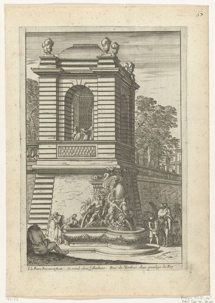 Editor: This is "Illustratie voor 'Den Arbeid van Mars' van Allain Manesson Mallet," a 1672 drawing, print, and engraving in ink by Romeyn de Hooghe, housed at the Rijksmuseum. The detail is amazing, and the image feels like it's depicting some kind of industrial enterprise. What jumps out at you? Curator: For me, the most interesting element is the relationship between the depicted labor and its purpose. We see figures engaged in what appears to be transporting materials – likely destined for the construction or maintenance of that grand building. The artist challenges us to consider the immense effort behind such displays of wealth and power. Do you think it presents a celebratory or critical view? Editor: I’m unsure. It almost seems neutral – showing the mechanics of maintaining that lifestyle without judgment. But wouldn't a celebration emphasize the *outcome* rather than the labor itself? Curator: Precisely. By foregrounding the ‘means of production’ – the physical labor and material processes – De Hooghe subverts the traditional focus on aristocratic life. The drawing transforms it from the realm of inherent right to one sustained by often-invisible toil. Consider how the landscape is literally shaped and consumed to build and maintain the architectural element and garden: is the human action symbiotic or exploitative? Editor: It sounds like it encourages a view of the consumption and lifestyle depicted in terms of its reliance on working bodies. Thanks; that changes how I look at Baroque art generally. Curator: Absolutely! Thinking about the materials and their origins, combined with the social context of labor, gives us a fresh perspective.