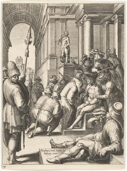 Jacques de Bie created this engraving, Christus voor Herodes, which translates to Christ Before Herod, during a time of religious and political conflict in Europe. De Bie lived and worked in Antwerp. Then, Antwerp was at the heart of the Counter-Reformation and the Eighty Years' War. This print illustrates a scene from the New Testament where Christ is sent to Herod by Pilate. The composition places Christ, surrounded by soldiers, before Herod, who sits enthroned, embodying earthly power. Consider how the figures are rendered. Christ appears almost vulnerable, while Herod is depicted with the symbols of royalty and authority. What does it mean to portray Christ in such a way? Does it challenge or reinforce the narratives of power and divinity? De Bie’s print is a testament to how religious narratives can be visually constructed to reflect the socio-political tensions of the time.