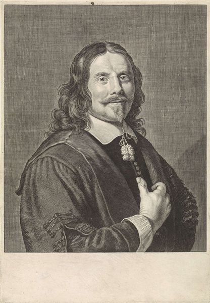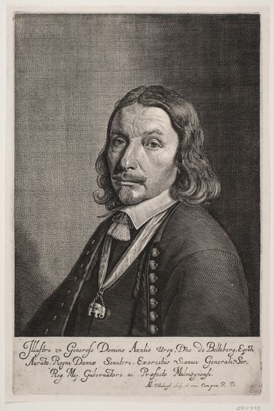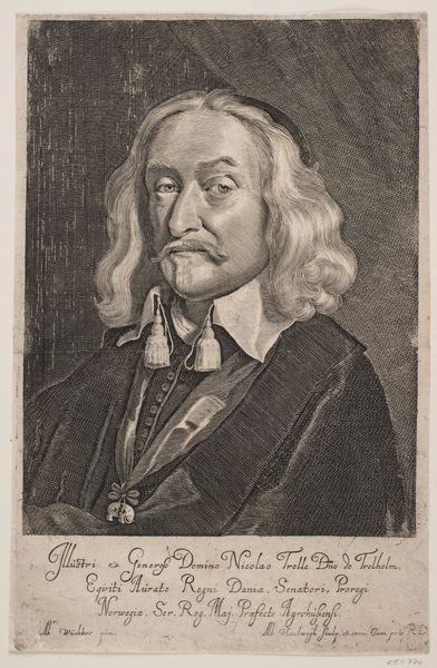 Albert Haelwegh created this portrait of Axel Urup, likely as an engraving, sometime in the mid-17th century. The piece captures Urup, a prominent figure in Danish society, highlighting his status as a senator and military leader. The portrait provides a glimpse into the era's rigid social hierarchies. Urup's attire and the symbols of rank reflect his privileged position within the Danish aristocracy. Consider the historical backdrop against which this portrait was created: a period marked by conflicts and power struggles between European nations. Urup's role as a military leader underscores the importance of military strength and political maneuvering in shaping national identity. How does the portrait engage with or challenge the established norms of representation? Does it offer insights into Urup's character, or does it primarily serve to reinforce his public persona and societal standing?