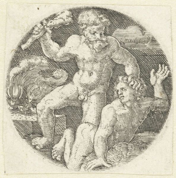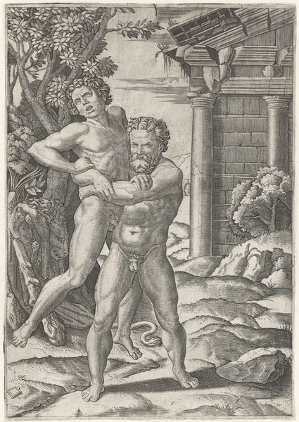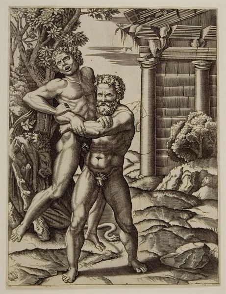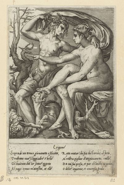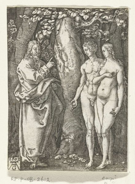 Johann Sadeler I created this engraving of Adam and Eve sometime in the late 16th century. This piece reflects the cultural norms and religious beliefs of the time, deeply rooted in biblical narratives. The image portrays Adam and Eve in the Garden of Eden, a pivotal moment of temptation and the fall from grace. The serpent coiled around the tree is offering Eve the forbidden fruit. Look at how the composition places Eve in a subordinate position to both Adam and the serpent. Representations like this reinforced societal gender roles, portraying women as more susceptible to temptation. It's impossible to ignore the emotional weight of this scene. Consider how ideas about sin and morality, as well as gender, have been constructed and perpetuated through images like this. How does this historical representation resonate with contemporary discussions about gender, power, and knowledge? Sadeler’s work invites us to reflect on the stories we tell and the values they embed.