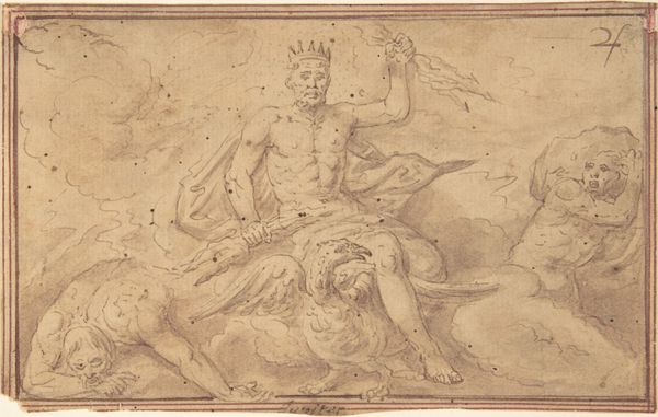 Hans Ulrich Franck created this drawing of Neptune and Amphitrite in pen and brown ink with gray wash on paper. Notice how the circular composition immediately draws our eyes into the dynamic interplay of form and line. The figures of Neptune and Amphitrite, rendered in a soft, gray wash, contrast with the kinetic energy of the horses, sketched with bold, assertive strokes. Franck masterfully employs the classical subject matter of the sea god and his wife to explore the baroque aesthetics of movement and emotion, giving the scene a sense of drama and liveliness. The artist's choice to concentrate his use of chiaroscuro around the figures of Neptune and Amphitrite anchors them within the dynamism of the scene. By observing these compositional and tonal choices, we can see that Franck creates a dialogue between classical themes and a more expressive baroque style. This dialogue invites continuous reinterpretation.