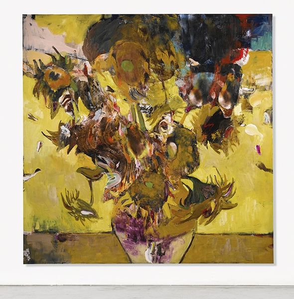 Curator: James Rosenquist's 1984 mixed-media painting, "Nasturtium Salad", immediately strikes me. The composition is so vibrant. Editor: Yes, the high gloss acrylic certainly pops, but I find the segmented face and clashing organic and artificial textures a little unsettling. Like processed food masquerading as something natural. Curator: Interesting take. Rosenquist came up working as a billboard painter, which definitely informs his aesthetic and use of everyday imagery. His pieces often reflect the fragmenting effect of mass media. Editor: You can see that in how he handles paint—the way he applies such sleek colors next to areas of near-photorealism, all disrupted by these flat planes. It feels both machine-made and deeply crafted. What kind of cultural role do you see that disruption fulfilling? Curator: During the Pop Art movement, of which Rosenquist was a key figure, there was this deliberate blurring of the lines between high art and commercial art. It challenged established hierarchies, forcing the viewer to confront the bombardment of imagery in contemporary life. Here, the model's face, obscured by hard-edged stripes and mixed with foliage, evokes themes of beauty standards. Editor: I suppose those segmented lines feel restrictive. Are we meant to feel constrained by societal pressures regarding physical appearances? And there is a sense that everything we're presented with is a surface or a flat façade that has been produced for us, and our own experiences are processed to reflect it? Curator: Exactly! His engagement with portraiture here highlights its function as commodity as well as record, suggesting it’s inextricably intertwined with market forces. Editor: He certainly brings his production skills to the gallery walls, prompting discussions about who defines what's "real" and the manufactured environments we inhabit daily. Well, that certainly gave me food for thought. Curator: And for me, it highlighted the ways that Rosenquist's paintings challenge the assumed neutrality of the images that shape our culture.