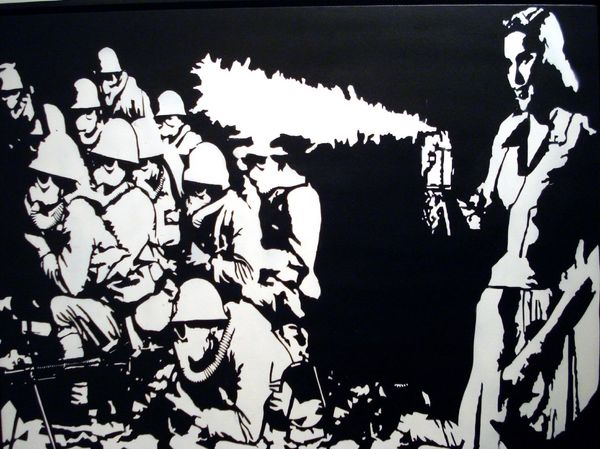 Curator: Wolf Vostell's print, titled "Saigon," uses stark contrasts to create a chilling image. Editor: It's definitely unsettling. The textures seem almost abrasive, amplifying the horror. Curator: The central figure's expression is particularly powerful. His face seems to encapsulate a collective trauma experienced during the Vietnam War era. Editor: The composition is jarring, too. The superimposition of the executioner and the victim complicates the reading, like a collapsing visual field. Curator: Precisely. It speaks to how easily one's identity can be erased. This image calls upon a well of cultural memory and the burden of history. Editor: The stark monochrome palette also reinforces that feeling of historical distance, like a faded newspaper photograph. Curator: Indeed. A sobering reminder of how images can simultaneously document and distort reality. Editor: It makes me wonder what we choose to remember and how.