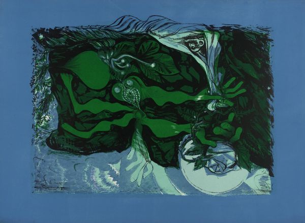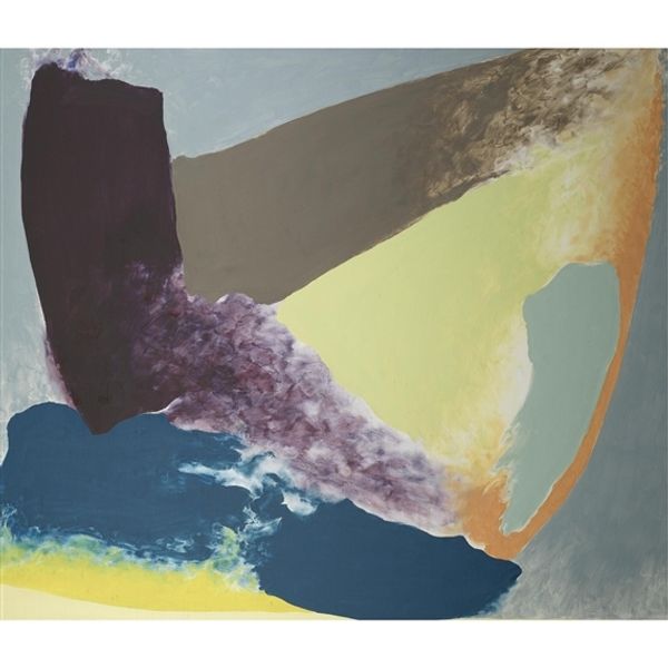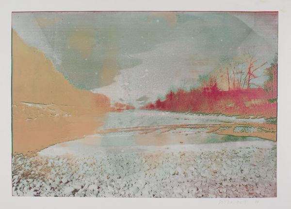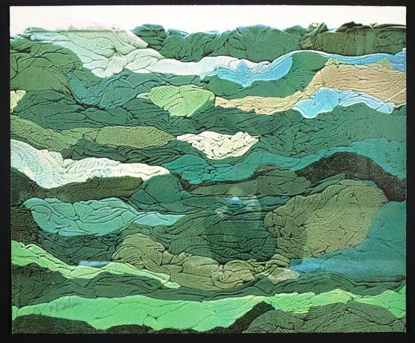 Howardena Pindell's "Peter Squares Waterfall Johnson Vermont TP 5" presents a landscape rendered in muted blues, greens, and creams, creating a serene yet subtly unsettling visual experience. The composition is structured by layers of abstracted forms which suggest land, sky, and water. Pindell's approach destabilizes traditional landscape painting. The conventional depth and perspective are flattened, inviting us to question our orientation within the scene. The interplay between representation and abstraction creates a semiotic tension. Do we read the artwork as a landscape? Or as an exploration into form, texture, and color? The lack of clear focal points challenges our expectations, pushing us to engage with the artwork on multiple levels. Notice how the delicate balance of tones gives the artwork a transient quality, like a memory fading or a landscape obscured by mist. This functions aesthetically but also speaks to broader philosophical concerns about perception and representation. Ultimately, the artwork is less about depicting a specific place, and more about how we perceive and interpret the world around us.