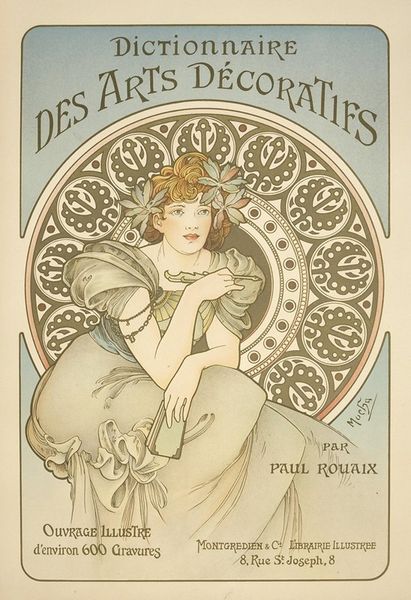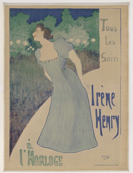 Curator: What a find. "Vrouw lezend in een tijdschrift, staand onder een boom," a lithograph poster from 1902. It evokes a sense of quiet contemplation. What strikes you most about it? Editor: I am intrigued by how the woman reading seems totally engrossed in her magazine, almost unaware of her surroundings. What is it about this work that particularly resonates with you? Curator: It’s fascinating to consider the poster in the context of the era's burgeoning consumer culture and changing gender roles. The Bon Marché was one of the first department stores, revolutionizing shopping. And here we see a woman, presumably a customer, represented as cultured, intellectual. What's her relationship to consumerism and to the text in her hands? Is reading a form of escape or empowerment for her? How complicit is the piece itself in shaping perceptions of the female gaze? Editor: Those are great questions! So, it is a pretty radical thing, actually, a woman being educated? I mean, the simple act of reading becoming some kind of social or maybe even a political thing. I never thought about that! Curator: Exactly! And Art Nouveau, with its emphasis on organic forms and stylized beauty, was often used to sell these new experiences to women. How does the depiction of nature, specifically, in the poster support the depiction of the ideal consumer lifestyle? Editor: Hmmm. Now that you mention it, I noticed that, while the text is sharp and really readable, the forest where the woman is standing gets more diffuse toward the back, where the details get lost, leaving the forest without definition and therefore…abstract? I love that idea! What a clever way to present this landscape. Curator: Indeed. Consider how even the composition of the bookcase on the left alludes to the idea of the mind or inner experience. We're drawn to ask whether reading literature here becomes another avenue to explore the terrain of modern consumer desire and access new realms. Editor: Wow, I would never have gotten that! Thanks to your analysis, I have a greater understanding of the historical and social themes represented in this single image. Curator: Likewise, your perspectives provide new dimensions that enrich this dialogue!