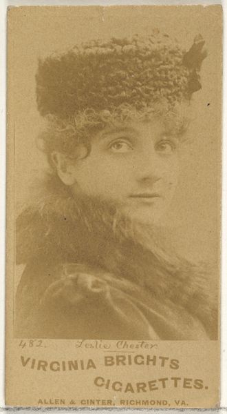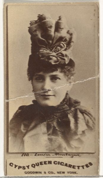 Curator: This is "Edith Kingdon," from the Actors and Actresses series for Virginia Brights Cigarettes, dating from around 1885 to 1891. The portrait combines drawing, photography, and printmaking techniques in a miniature format. Editor: There's a certain wistfulness to her gaze, isn't there? The sepia tones soften the whole image, and even though it's small, it has a surprisingly intimate feel. Curator: The "intimate feel" is calculated, part of the marketing strategy of Allen & Ginter, the company behind the series. These cards were included in cigarette packs. Collectability drove sales. It's interesting to consider the labour involved in producing these images at scale and the consumption habits they fueled. Editor: Indeed, it’s striking how consumer culture weaves itself into the symbolic fabric of the time. Notice the hat and the adornments, signs of aspiration, not to mention the single rose pinned to her bodice – a common symbol for romance and beauty. What does her sideways glance signify to the consumer? Curator: It signals an engagement, a personal connection the buyer can have just by owning the pack. This particular style incorporates aspects of Japonisme, mirroring the mass-produced woodblock prints of Ukiyo-e masters, making “high art” accessible to the public while selling a commodity. Editor: The Japonisme influence really jumps out now that you mention it. Her look, slightly melancholic yet captivating, is so similar to figures depicted in Japanese prints. Beyond just commercial appeal, the rose, her gaze, these details all project a complex narrative on a small scale. They speak volumes. Curator: Ultimately, though, this narrative is dictated by its purpose. Mass production flattens complexity to deliver a brand message of sophistication and aspiration connected with a specific product, using available production means. The image has inherent aesthetic appeal that belies a simple equation of supply and demand. Editor: A compelling tension. Looking at "Edith Kingdon" has broadened my understanding of how desire is shaped by both individual yearning and societal forces encoded in ubiquitous images. Curator: Absolutely. Considering the cigarette card illuminates how industry and artistry combine in objects consumed at different levels of society and perceived both functionally and culturally.