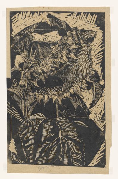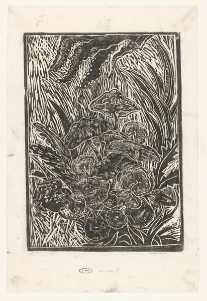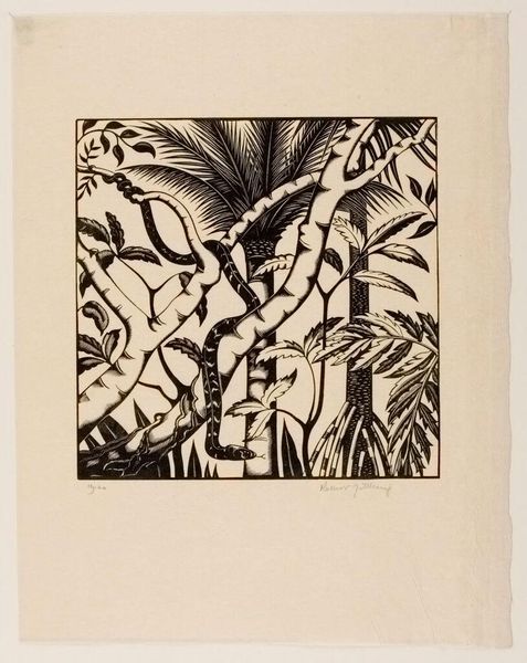 Janus de Winter made this print, "Lizard on a Log," using linoleum, a common floor covering, to bring an everyday sensibility to the realm of art. The printmaking process begins with the artist carving a design into the linoleum, then inking the surface and pressing it onto paper. The stark contrast between black and white in this print speaks to the directness of this method. Look closely, and you can see the marks left by the cutting tools, giving texture to the leaves and the lizard's scales. The choice of linoleum, rather than a more traditional material like wood or metal, suggests a desire to democratize art-making, utilizing materials that were readily available and affordable. In this way, de Winter elevates the ordinary, inviting us to reconsider the value and potential of everyday materials in artistic expression. It reminds us that art can be found, and made, in the most unexpected places.