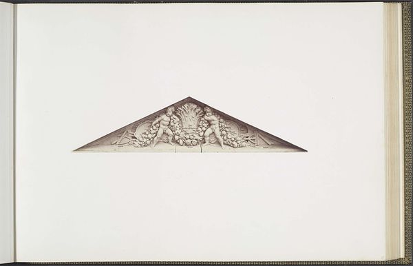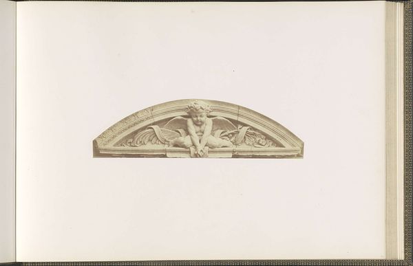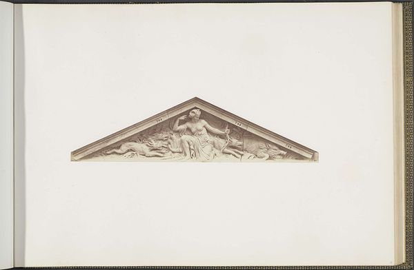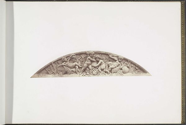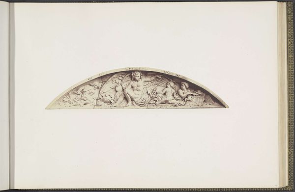 Editor: Here we have a photograph by Edouard Baldus, taken around 1855 to 1857, depicting the plaster models for sculptures at the Louvre, titled "Les Beaux-Arts" by Auguste Poitevin. It’s fascinating to see this intermediary stage. The relief itself feels very classical; how would you interpret this work formally? Curator: The photograph presents a study in form and line. Notice how the semi-circular composition reinforces the allegorical nature of the sculpture. The figures, rendered in exquisite detail, possess a palpable three-dimensionality despite being captured in two dimensions. Note also, if you will, how Baldus uses the contrast in light to bring forward the structure and the mass. Editor: Yes, the texture is beautifully rendered in the photograph. I wonder, do you think the photographic medium itself affects how we perceive the sculpture's formal qualities? Curator: Undoubtedly. Photography flattens and reinterprets space, but consider the advantage: Baldus captures a specific moment, isolating the sculptural forms in a way that the direct viewer of the actual architectural element couldn’t. It's also interesting that the absence of color draws attention to the relationship between light and shadow which, again, affects depth perception. It directs our attention to the essence of its design. Editor: That’s a great point. The contrast really highlights the texture and volume of the sculpture in a unique way. This really changes how I see photography's relationship to sculpture! Curator: Precisely! It underscores photography's transformative capacity. Each viewing provides a fresh structural dialogue and reveals new information on a visual level.