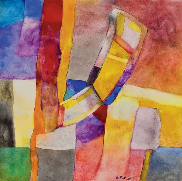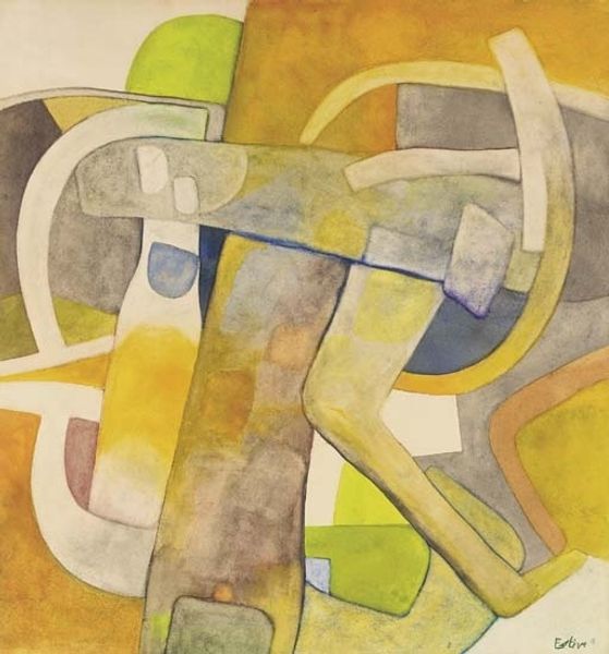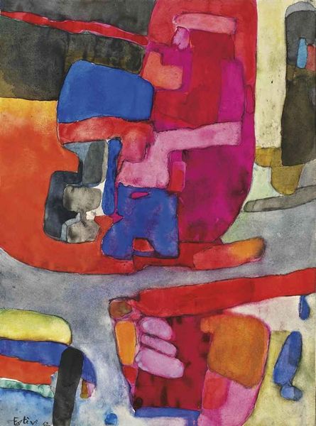 Curator: The swirling, energetic piece before us is simply titled "Untitled." Maurice Estève created it in 1961, employing watercolor to build up these vibrant layers of color. Editor: My first impression is of pure joy. The colors! The way they bleed and blend—it’s a dance of hues. And there is almost an immediate recognition, too; I feel like these organic shapes reach something essential and primitive inside me. Curator: Indeed, there is a remarkable Fauvist sensibility here, though filtered through the lens of Abstract Expressionism, a powerful artistic movement at mid-century. One might be tempted to find some organic objects—fruits, leaves, flowers—in these sinuous forms. Yet, that would distract us from the artist's overall interest in a pure and joyful study of abstraction. Editor: These abstract shapes suggest something more profound, something totemic. These blobs of earthy greens and browns bring to mind Neolithic cave paintings; that looping lavender ribbon makes me think of some intergenerational pattern repeated across countless artworks, a sort of collective dream. Curator: Estève came of age in Paris during the interwar years, absorbing cubism and expressionism while navigating the rise of totalitarianism and eventually Nazi occupation. Even after World War II and its unspeakable traumas, he felt acutely that abstraction best articulated the paradoxes of his epoch: both utopian aspiration and disillusionment. Editor: Which explains perhaps its enduring appeal. When a symbolic language is emptied of specific narratives, we can imbue forms like these with new individual meanings—responding viscerally as well as rationally. A painting can carry the unnamable traumas of war even as it communicates sheer joie de vivre. Curator: Certainly. Art and the artists are deeply shaped by historical forces. Estève's oeuvre speaks both to the utopian promises of the early 20th century avant-garde and to the postwar embrace of the image as an affective technology. Editor: Well, I leave with that sense of simultaneous freedom and historical weight, seeing how these ostensibly playful shapes evoke resonances in our memories.