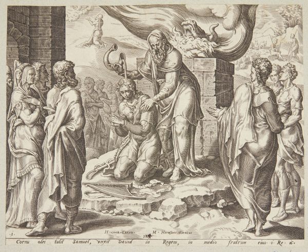 This engraving, titled "Lot verlaat Sodom", presents us with a scene of biblical exodus rendered through a structured composition. The monochromatic palette emphasizes form and texture. The arrangement directs our gaze from the left, where an angel pulls Lot and his daughters away from the doomed city, towards the figures on the right, Lot's wife and daughters, each delineated with precise lines and shading. The artist uses scale and proportion to distinguish between the divine and the mortal. The angel's towering presence juxtaposed with the city’s destruction signifies a break from worldly existence and a turn towards spiritual salvation. The angel’s gesture is decisive and forceful, contrasting with the expressions of anguish and uncertainty worn by Lot's family. The classical lines of the architecture on the right ground the composition and provide a stable framework for this depiction of chaos and divine intervention. Through this structured arrangement, the artwork challenges fixed meanings, prompting a reevaluation of faith, obedience, and the consequences of defiance.