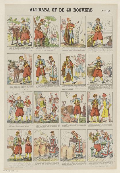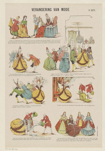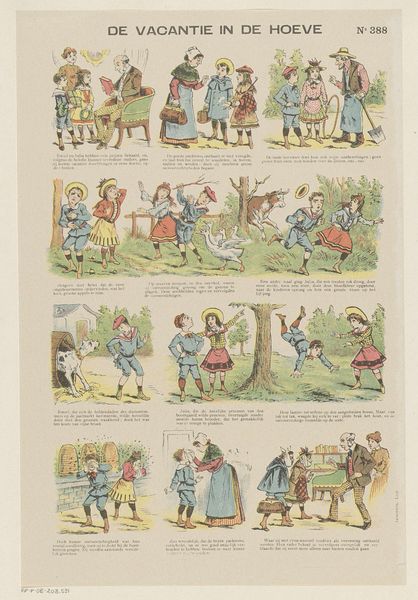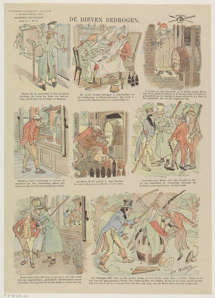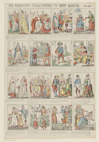 Demoulin & Co. Vignerot created this print called "Ezelsvel" – or "Donkeyskin" – using a chromolithographic process, as part of the Imagerie Artistique series in Paris. We see a sequence of images, likely depicting scenes from a fairy tale, and it's worth considering how the narrative structure of the artwork speaks to its broader social context. The fairy tale alludes to an incestuous father-daughter relationship, which touches on complex cultural anxieties around family, power and transgression. The visual codes used here, the clothing, the architecture, reference established artistic conventions for depicting royalty and peasants, and understanding these associations helps us interpret the print's commentary on social hierarchies. To fully grasp the artwork’s meaning, one might explore historical records of French publishing, folklore studies, and feminist interpretations of fairy tales. Such interdisciplinary research illuminates how seemingly simple images can reflect complex social and institutional dynamics.