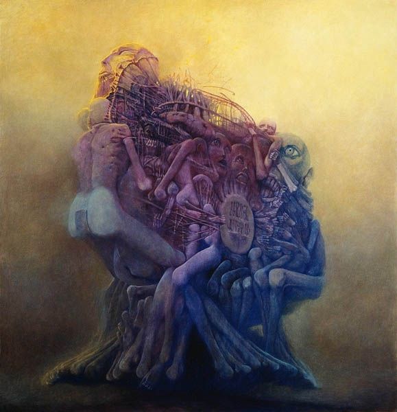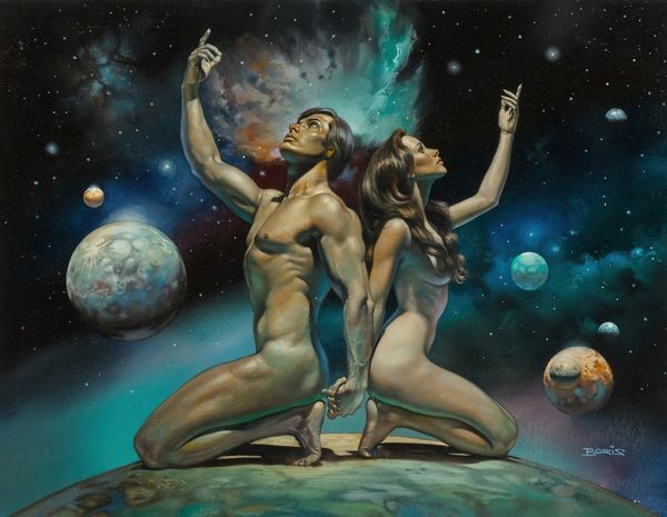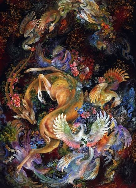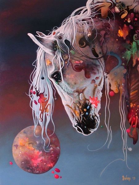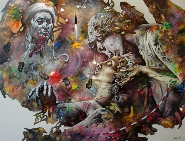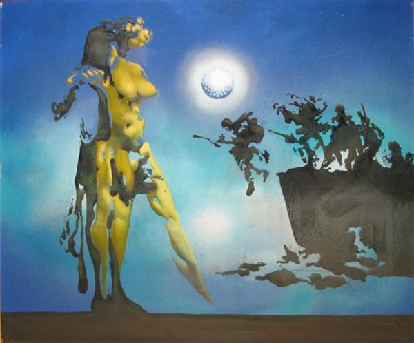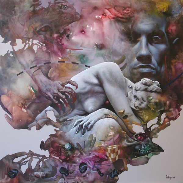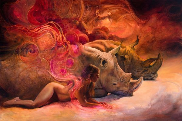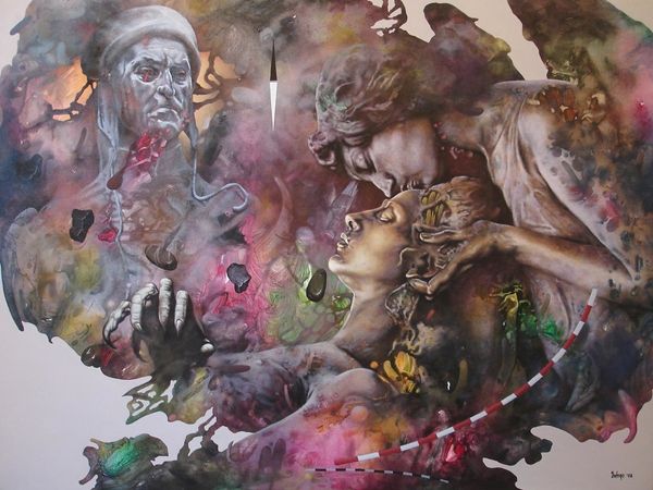 Here we see Dragan Ilić Di Vogo’s painting, Phantasmagoria, an artwork that invites viewers into a world where classical forms meet surreal imagery. Born in 1962, Ilić Di Vogo grew up in a period of political and social upheaval in Yugoslavia, and his work is often interpreted through the lens of these experiences. The muscular figures in the center evoke classical sculpture, yet their gray tones and the swirling, dreamlike colors surrounding them suggest a world in flux. The artist incorporates chameleons, animals known for their ability to change and adapt, as a symbol of identity in a shifting world. Ilić Di Vogo once said, "My paintings are a reflection of my inner self." This piece is a deeply personal exploration of transformation and resilience. It blends traditional representation with alternative narratives, expressing the complexities of identity in a world marked by constant change.