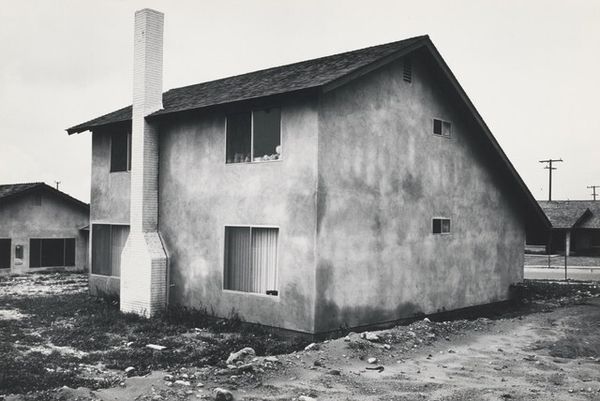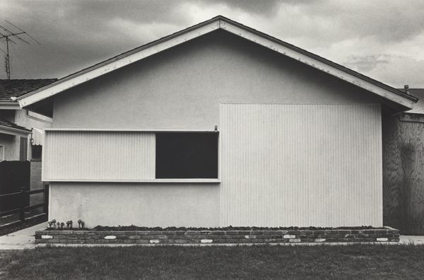 Editor: So, here we have Lewis Baltz’s "Tract House #11," a gelatin silver print from 1971. It’s strikingly austere. The stark black and white, the unadorned architecture... it feels almost confrontational in its plainness. What do you see in this piece? Curator: I see a meditation on the psychology of place, a ghost in the machine of modern living. Notice how Baltz flattens the perspective, almost denying depth. The house becomes a sign, an ideogram representing something larger than itself. The window, dark and impenetrable, serves as a vacant stare. Do you sense how the architectural elements - the roofline, the wall, the window - function almost as abstract symbols, charged with latent meaning? Editor: Yes, definitely. The window is particularly interesting...like a void. But what meaning is loaded into such a blank symbol? Curator: Perhaps a critique of the utopian promise of suburbia? Think of the 1970s. Mass-produced housing developments were popping up everywhere, promising an idealized version of the American Dream. Yet, Baltz gives us a feeling of isolation, conformity, and perhaps even the repression of individual expression. The repeated geometric forms speaks to standardization; does it liberate, or confine? The barren landscape reinforces this sense of alienation, reflecting our own cultural anxiety about a rapidly changing world. It almost reads as a hieroglyph of suburban ennui. Editor: That makes sense. So the symbols, simple as they are, point to something more complex than just a house. It's like a code to decipher the mood of a time. I never thought of suburban landscapes having so much cultural weight. Curator: Indeed. And understanding that weight is key to decoding the symbolism Baltz presents. The apparent banality is, in fact, a potent carrier of cultural memory.