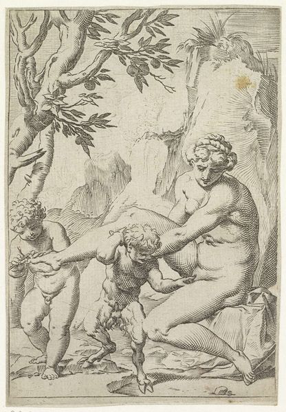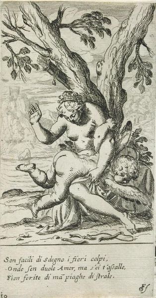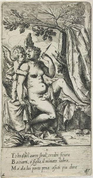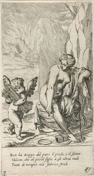 Editor: This is "Amor Demanding the Bow from Venus" by Odoardo Fialetti. It's a small print. I'm struck by the power dynamic presented here; it feels charged. What do you see in this piece? Curator: It certainly is. Considering Fialetti's historical context, this image resonates with the ongoing societal negotiations around power, particularly gendered power. Venus, often symbolizing feminine agency, is here seemingly coerced by Amor. How might we interpret this interaction through a feminist lens? Editor: So, you're saying this isn't just a mythological scene, but a reflection of real-world power struggles? Curator: Precisely. The act of Amor demanding the bow can be seen as a metaphor for the challenges women face in maintaining their agency. It prompts us to question: who controls the narrative, and how is power negotiated within relationships? Editor: That shifts my understanding completely. I was focused on the characters, but now I see the artist commenting on societal roles. Curator: Exactly. It encourages us to unpack those assumed roles and consider their implications, even within seemingly classical or mythological contexts.