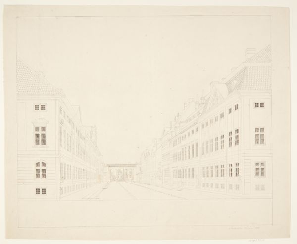 Editor: Here we have "Study for Somerset House, Strand, from Microcosm of London," dating back to about 1809, by Augustus Charles Pugin. It's an etching in ink, graphite, and watercolor. What immediately strikes me is the linear quality of the drawing; it almost feels architectural in its precision, and perhaps a bit sterile in that precision. What do you see in this piece? Curator: Your observation is quite astute. The essence of this work resides within its meticulous rendering. Note how Pugin employs linear perspective, dividing the space with orthogonal lines. What effect do you think the limited tonal range has on your interpretation of the drawing? Editor: It feels almost like a blueprint. The light wash gives depth but not much warmth, thus a rather cold reading. Curator: Precisely. It's about the formal language. Consider the structure; a balance between the monumental facade and the implied depth of the streetscape. Do you perceive any tension created by this compositional choice? Editor: I see that it may not be entirely natural, yet compelling, yes. It does keep the eyes busy going in different directions as the artist guides us. What strikes me is how modern this aesthetic seems in spite of being over 200 years old. I imagine it could be a great preparatory drawing for an elaborate finished etching or watercolor, a peek into the making of the London Microcosm series. Curator: Indeed. The inherent formalism, its rigorous design and carefully planned construction are crucial. Editor: That’s given me a new way to approach architectural drawings. Curator: And it reinforces the importance of structure over sentiment.