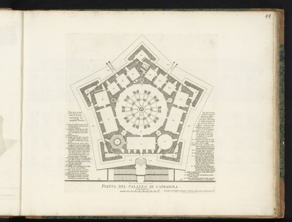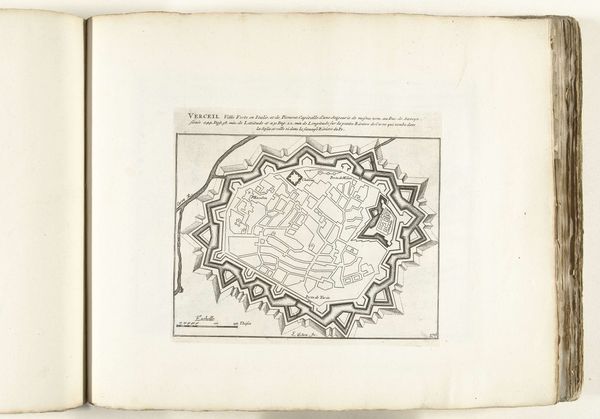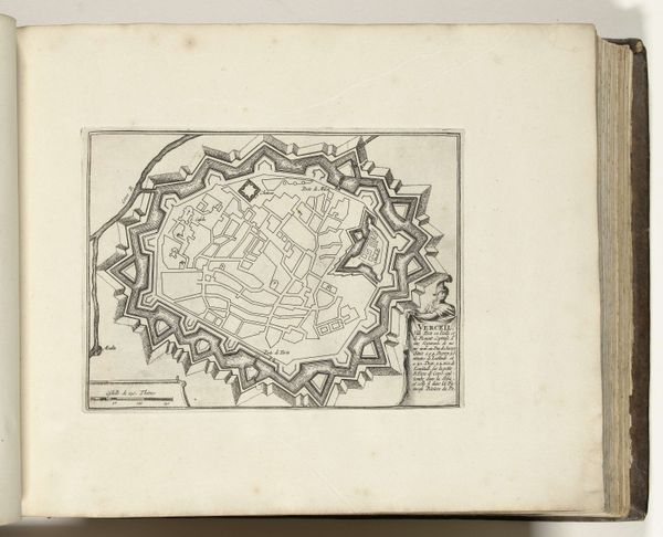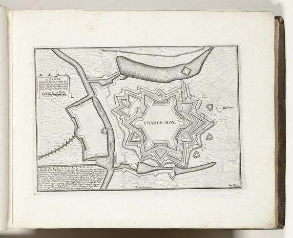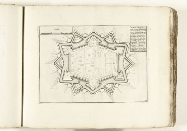 This engraving from 1693, titled 'Vijfde plaat met de zeshoek in de vestingbouw,' presents a fortress design rendered with meticulous detail. The print, executed in stark black lines against a pale ground, immediately strikes one as a study in geometric precision and spatial logic. The hexagon, the base form of the fortress, extends outward into a complex array of bastions and angled walls. This rigid geometry speaks to the period's obsession with order and control, reflecting larger philosophical concerns about rationalizing space and power. The lines articulate not just physical structures but also a conceptual framework, suggesting a world view predicated on systems of defence. The act of mapping and diagramming was critical to the creation of knowledge, mirroring the era's emphasis on categorizing and understanding the world through scientific and mathematical principles. The engraving invites us to consider how such representations are not merely descriptive but constitutive, shaping the very realities they depict.