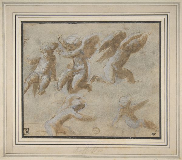 Editor: This is "Various Figure Studies" by Filippino Lippi, created around 1493 to 1495. It's a drawing, seemingly on toned paper. I’m immediately drawn to the almost ghostly quality of the figures and how they're positioned within this architectural frame. What historical context informs how we should interpret a drawing like this? Curator: Drawings like this were fundamental to artistic production in the Renaissance. But they weren’t necessarily meant for public display as finished artworks. Rather, they are key to understanding the workshop practices and the collaborative dynamics of the time. Editor: So, it's more about process than presentation? Curator: Exactly! Consider who would have seen this. It likely circulated within Lippi's workshop. Other artists, assistants, and perhaps even patrons might have viewed it. Its "public" was a specific artistic circle, a crucial detail often overlooked. How does that change how you understand the figures? Editor: I suppose knowing that affects my view. Instead of a completed thought, it feels like an open conversation between the artist and his collaborators. Is it meant to showcase skill or to be studied and adapted? Curator: Both. Skill demonstration was part of artistic patronage; showing your abilities helped win commissions. But remember, artists during this period weren't solitary figures. Workshops involved hierarchy, collaboration, and knowledge-sharing. Drawings were a tool for shaping artistic language as much as developing a design. What is your final thought on how our view changes about public accessibility of art? Editor: This definitely changes my view of Renaissance art. This drawing feels less like a precious artifact and more like a vital piece of artistic dialogue from a vibrant community, normally kept private. Curator: Indeed. The very existence of this work today highlights how institutions selectively frame what constitutes 'art' and shapes art history narratives.