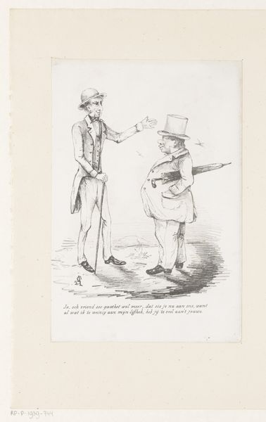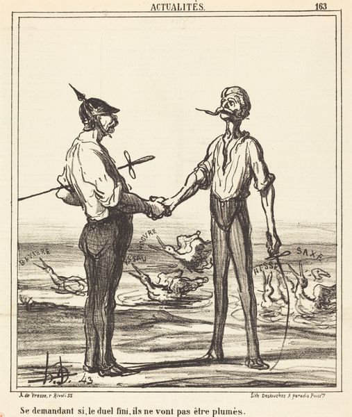 This print by Johan Michaël Schmidt Crans was made in 1868 using etching or engraving, processes that involve carving lines into a metal plate, inking it, and pressing it onto paper. It depicts the Dutch congratulating the Spanish on their revolution. The medium of printmaking is itself relevant to the subject matter. Printmaking's relatively low cost allowed for mass distribution of images and ideas, making it an effective tool for political discourse during times of social upheaval, exactly like the 1868 revolt in Spain. The linear quality of the print, created through the careful etching or engraving process, lends a sense of clarity and directness to the message. Consider, too, the labor involved: each line carefully incised, each print meticulously produced. These prints circulated widely, shaping public opinion and contributing to the broader social and political landscape. It's a reminder that even seemingly simple artworks can be powerful agents of change, reflecting and influencing the world around them.