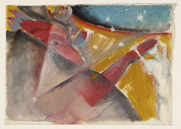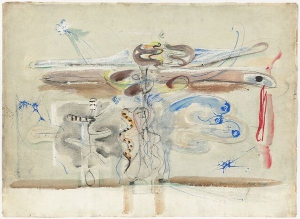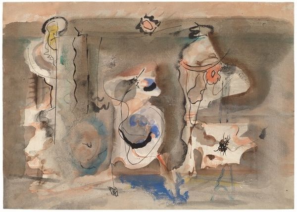 Curator: What immediately strikes me about this piece is its almost hesitant quality. There's a vulnerability in the loose lines and muted palette, a stark contrast to Rothko's later, more assertive canvases. Editor: Indeed. This watercolor and ink drawing, "Abstract Composition in Blue, Black, Gray, and Tan," thought to be created between 1944 and 1946, showcases Rothko’s journey towards the signature style he’s so known for. You see echoes of surrealism and a grappling with form. How do you interpret the interplay between the defined and the amorphous here? Curator: For me, the geometric shapes against the wash of color speaks to the push and pull of order versus chaos, of knowing and not-knowing. Considering the time frame, the war's profound impact must be considered – that existential questioning of the world's construct. There’s something quietly defiant here, in his insistence on the abstract in the face of such stark realities. Editor: Absolutely. The mid-1940s was a period of intense socio-political upheaval. The art world too was reacting against traditional structures, looking for new means of expression. Do you find that this work participates in a certain type of dismantling of old institutions? The style, in that sense, is its own message? Curator: I see it more as a deconstruction of the self. Look how the composition denies the eye any real resting place. Instead, we’re invited to linger in a space of uncertainty. Is it landscape, architecture, or some fragmented interior state? Perhaps he reflects an era of questioning imposed categories as a foundation for reconstructing identity through color and abstraction. Editor: Precisely. Rothko went on to become one of the central figures in Abstract Expressionism. Pieces like this show his origins, demonstrating how the abstract provides liberation from pre-defined concepts of identity while encouraging new narratives of society. Curator: It makes you consider the socio-cultural impetus of artists. What must that artistic process have felt like in those times, caught between external turmoil and the stirrings of a completely novel mode of expression? Editor: A crucial work. Hopefully it prompts some reflection for listeners today. Curator: Indeed. An artistic revolution of its own.