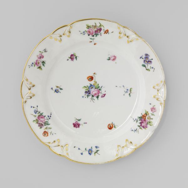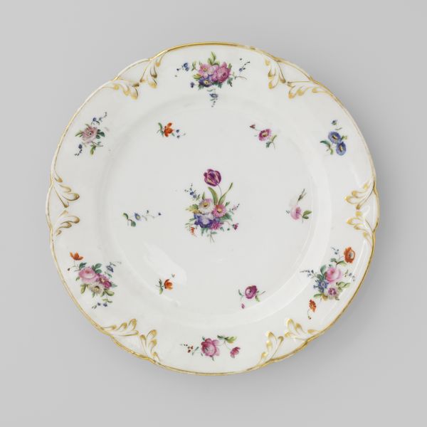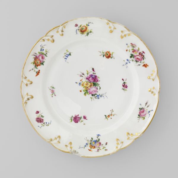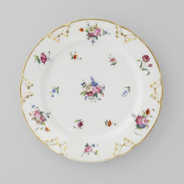 Curator: Here we have a plate from around 1839, created at the Dominique Denuelle Factory. The title is "Plate with bouquets and flower sprays." It's currently held at the Rijksmuseum. Editor: It feels very delicate. The floral decorations scattered across the white surface have a certain lightness, almost like they’re floating. Curator: Absolutely. These decorative plates speak volumes about the era’s fascination with ornamentation and refinement. The Dominique Denuelle Factory was quite popular during that time, and this piece reflects the growing market for luxury porcelain among the bourgeoisie. Editor: It’s interesting to consider this object beyond just its visual appeal. The materiality itself – porcelain meticulously painted – tells a story about labor. How many hands touched this piece before it reached its final form? Curator: That's a fantastic point. Consider also the social context of displaying such an item. This wasn’t just about eating; it was about showcasing wealth and status through the careful consumption of artisanal goods. Editor: Exactly. The act of collecting these pieces isn't just for utility but social display. You see how it blurs the boundaries between functionality, craft, and artistry, making you think about the kind of lifestyle it represents. Curator: You know, viewing these plates is also interesting considering the art market now. Plates and pieces such as these are considered works of art now, showcased behind glass in places like the Rijksmuseum. That elevation of something that was utilitarian shows how perceptions change through time. Editor: And those flowers aren't just pretty—they are indicative of floral imagery's presence in all aspects of culture. It is also important to appreciate the level of craft—each flower painstakingly placed on porcelain by human hands. Curator: Agreed, and thanks for directing our focus back to the labor that crafted these pieces! Editor: Definitely. Looking at objects like this prompts reflection on the layers of artistry, labour, and even socio-economics at play in everyday decorative items. Curator: Yes, from its craftsmanship to the statement it made about taste and societal status in 1839, a plate like this contains more than one might think.