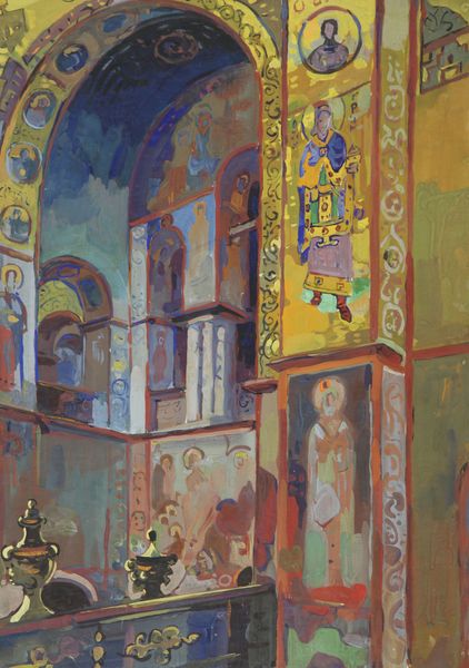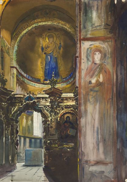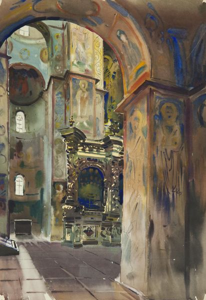 Editor: William James Müller's watercolor, "Rouen: Apse of St Vincent," captures an interior church scene with figures in the foreground. The architectural details are impressive. What symbolic readings do you find in the image? Curator: The church's architecture, with its pointed arches and stained glass, speaks to a reaching towards the divine, a visual language developed over centuries to inspire awe and reverence. What emotional impact do you think the blurred figures have? Editor: They make me feel like a ghost, observing a world I can't touch. Curator: Precisely. Müller uses these figures to create a sense of timelessness. The symbols of faith and the ephemeral nature of human presence combine to explore cultural memory and continuity. Editor: That's a fresh perspective. Thank you! Curator: Indeed, the visual vocabulary of art is rich with cultural meaning.