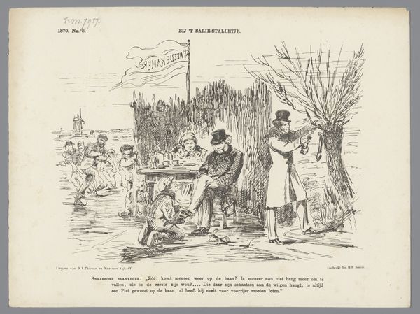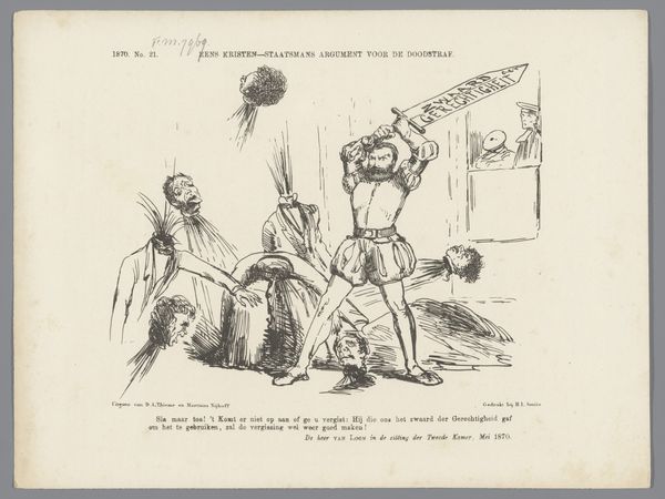 Jan Holswilder made this print titled *Financial Politics* in 1887, and it was published as part of a series called “Plate of the Lantern.” The image depicts two European sailors, who are stereotypically and cartoonishly rendered, coercing a Black man who clutches a sack labelled ‘gold’. This Dutch print reflects the expansionist financial policies of Europe at that time, and it clearly critiques the economic coercion of non-Western nations. The artist uses visual codes, associating the Europeans with order and power through their uniforms, while the Black man is represented as vulnerable and exploited. To fully understand this piece, we need to consider the history of Dutch colonialism and the economic policies that shaped its relationship with other nations. This historical context, along with an understanding of the artist’s intentions, allows us to interpret the artwork as a critique of the social structures of its time. Further study into Dutch financial policy during this period can provide more context.