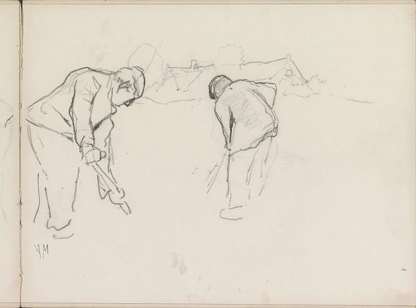 Curator: This is Jakob Nussbaum’s pencil sketch, Soldaten auf die Front sehend, created in 1916. Editor: There’s such a raw, unsettling bleakness to it, even with its sparse lines. It speaks volumes about the mental state of these soldiers, turning away toward a distant horizon. Curator: Indeed. Nussbaum's handling of line is fascinating here. Notice how the intersecting diagonal strokes define the volume of their jackets and legs. They’re delineated with incredible economy. Editor: And the way those lines are employed emphasizes a world on the brink of collapse, doesn't it? The subtle distortions and angularity hint at a psychological unease mirroring the fractured realities of war and masculine identity, echoing concerns raised by early feminist writers about the glorification of military conflict. Curator: I see your point. There is a distinct lack of symmetry that heightens the expressive impact of this study. We should also note the horizon line itself, that implied divide... how it underscores the compositional balance while creating tension. It anchors the two figures while paradoxically emphasizing their alienation. Editor: Absolutely. Placing them in this limbo reflects a Europe grappling with itself. They seem robbed of individual agency, reduced to cogs within a military apparatus indifferent to human suffering and reflecting back the power structures inherent in society. Curator: The visual tension you describe might also stem from how little tonal variation exists. It keeps us lingering on the formal structures and patterns themselves. Editor: Though its simplicity can initially deceive, this deceptively uncomplicated sketch resonates deeply when we contextualize it. It urges us to delve beyond the formal components and to actively reflect on both the human trauma and political contexts that inform its making. Curator: It is indeed a confluence of aesthetics and pathos. Nussbaum compels a powerful reaction even within these modest parameters. Editor: By unveiling those intersections, it provokes vital discussion that still informs our present.