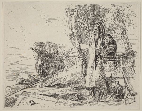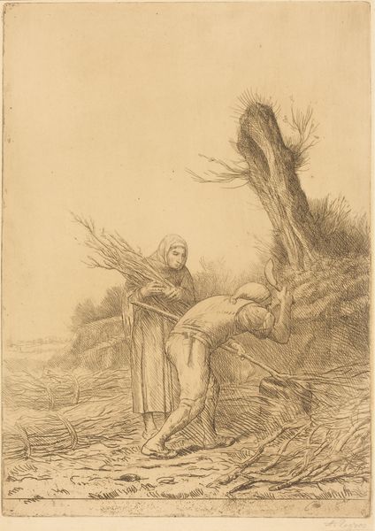 Alphonse Legros etched these Monks Chopping Wood, using the incisive lines to show us a scene of monastic life. We see the monks in their habits, gathered around the wood, one kneeling to chop. The axe, a primal tool of transformation and labor, immediately brings to mind ancient myths of forest deities and the sacred grove. The repetitive action of chopping wood, a form of physical penance and a humble submission to a higher power, reminds me of similar scenes in medieval illuminated manuscripts where monks were depicted in gardens and fields, connecting with nature as part of their spiritual practice. This symbol of hard labor takes on a new meaning over time; in the Renaissance, it signifies not only piety but also a return to simpler, more virtuous living. The image evokes a deep emotional resonance, as the monks' focused efforts and communal presence convey a sense of dedication, humility, and the timeless search for spiritual enlightenment. The symbolic gestures speak to us on a subconscious level. We see the resurgence of these very symbols throughout history, weaving a complex tapestry of meaning that speaks to our collective memory and our shared human experience.