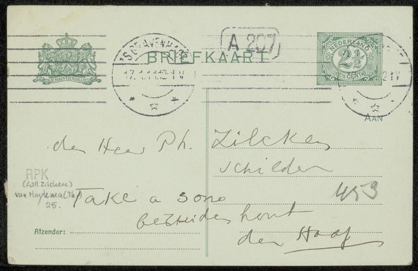 This postcard to Philip Zilcken by Theo van Hoytema is like a little world made from ink and paper. Look at how the script is so light, almost fading into the background, like a whispered secret. It reminds us that art isn’t just about big statements; sometimes, it's about the subtle, quiet moments. I’m drawn to the way the writing dances across the surface, light and airy, creating a sense of movement, a flow, which really makes it feel like a moment captured in time. Even the stamp becomes part of the artwork, like a little abstract shape that adds to the overall composition. It's like a conversation across time, not unlike the way we artists today are in dialogue with those who came before. Art is this ongoing exchange of ideas and feelings, never truly finished, always open to new interpretations, just like this humble but beautiful postcard.