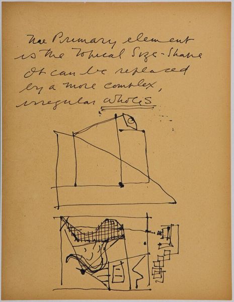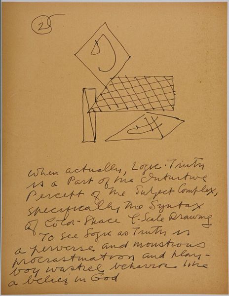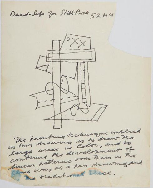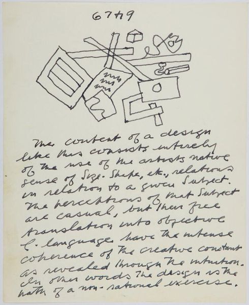 Curator: Welcome. We're looking at "Art Theory Text with Sketch" by Stuart Davis. It’s a piece in the Harvard Art Museums collection. Editor: Immediately, I see a contrast. The sketch is playful, almost whimsical, but the text underneath feels very serious. Curator: Davis's focus here seems to be on the labor involved in representing emotion, and how that act transforms the subject itself. It's the artist's hand at work, both physically and conceptually. Editor: Exactly. He questions the artist's role, the power dynamic between the artist, the subject, and the viewer. It's a very self-aware statement about art's function within society. Curator: The use of simple pen on paper also points to a democratization of art-making, breaking down barriers of access and expertise. Editor: And the fact that it's a theory piece itself challenges traditional definitions. It blurs the line between the act of creation and the theory behind it. It asks us to question where art begins. Curator: Seeing Davis grapple with these ideas reminds us that artistic practice is as much about material engagement as it is about conceptual exploration. Editor: This piece makes me think about how art can challenge the status quo.