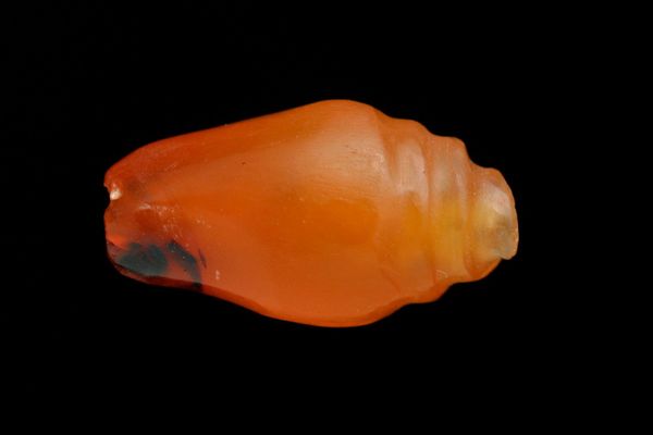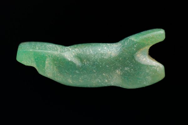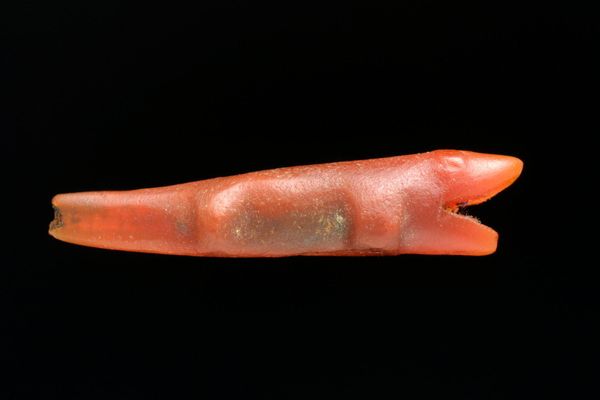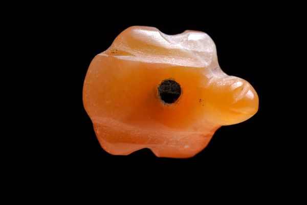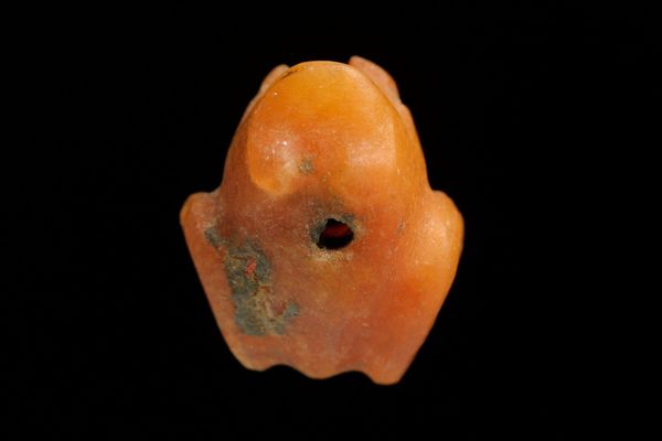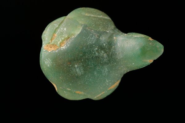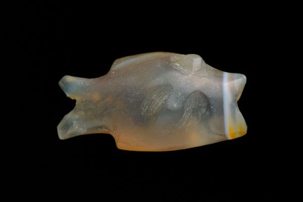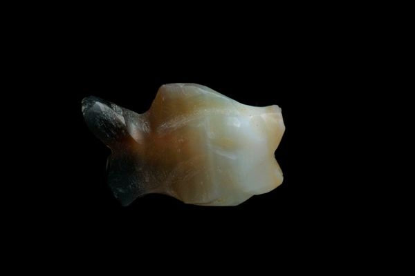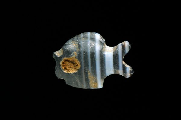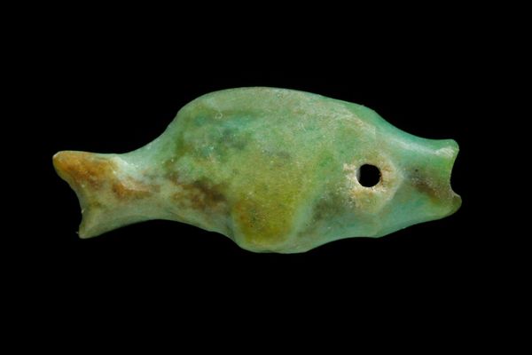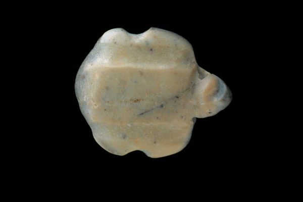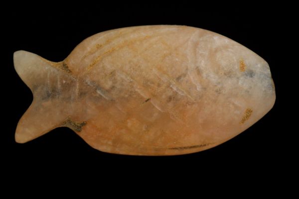 Curator: Look at this incredible Bead in the Shape of a Fish, an ancient carving that dates all the way back to the period of 501 to 800. It’s part of the collection at the Minneapolis Institute of Art. What strikes you about it? Editor: Well, right away, it's this pale, almost ethereal glow from the material. The stone—some kind of lightly colored bronze maybe?—it has this really smooth, tactile quality that makes me want to hold it. There's also a strange quietness, a sense of enduring patience. Curator: Indeed! And in its small form, the fish takes on this incredibly potent, culturally dense significance. In many traditions, the fish represents abundance, fertility, even transformation and faith. Think about the early Christian symbol of the Ichthys. Do you see those sorts of symbol working here? Editor: That's interesting. The thing I can't get past is how stylized it is. It feels deliberately simplified – almost geometric, especially in those faint cross-hatched lines suggesting scales. To me that looks more like an exercise in abstraction rather than a symbolic message carrier. If it does have a deep underlying purpose, it might take real socio-historical context to appreciate, doesn't it? Curator: I wonder though…could it be both? Perhaps the very act of distilling the fish to its essential form creates a more powerful vessel for its inherent symbolic weight? And there's its status as a bead too - something to be worn, to be kept close. This suggests intimacy, but also perhaps a visible marker of status or belonging. Editor: A constant, tangible link. A repeated pattern to signal its bearer was aligned to an existing culture and meaning system. I like that interpretation. Curator: Consider the place it held on someone's body; there’s that emotional connection there. The continuous nature of life echoed in its simple carving is profound when you consider the person that treasured this item all those years ago. Editor: Right. Thinking about its function…suddenly the material feels perfect. It's not flashy or precious. It whispers importance instead. Now, understanding a bit more about how it might’ve played out socially, my impression of it feels completely changed. Curator: I agree. Seeing it, contemplating its potential personal meanings while considering that larger, historical perspective gives a new connection to ancient lives. Editor: Absolutely. This small fish holds a vast ocean of thought.