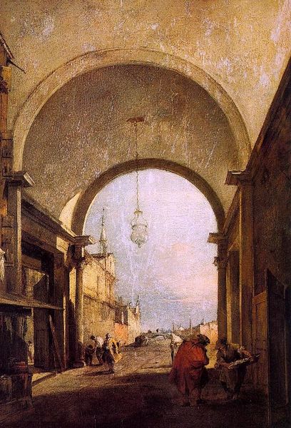 Francesco Guardi created this watercolor titled "An Architectural Caprice", which now resides in the National Gallery in London. The artwork is an intriguing assembly of architectural elements, immediately drawing us into a space that is both familiar and dreamlike. The dominant archway frames the scene, leading our eye towards the distant structures. Notice how Guardi plays with light and shadow, particularly the darker foreground that dramatically contrasts with the sunlit buildings in the background. This contrast not only creates depth but also invites a sense of theatricality. Guardi's architectural fantasies resonate with the ideas of his time, particularly the Enlightenment's fascination with reason and order. His work prompts us to question the interplay between reality and imagination, and how architectural forms can communicate meaning and emotion beyond their mere function. It's a structure that invites ongoing interpretation.