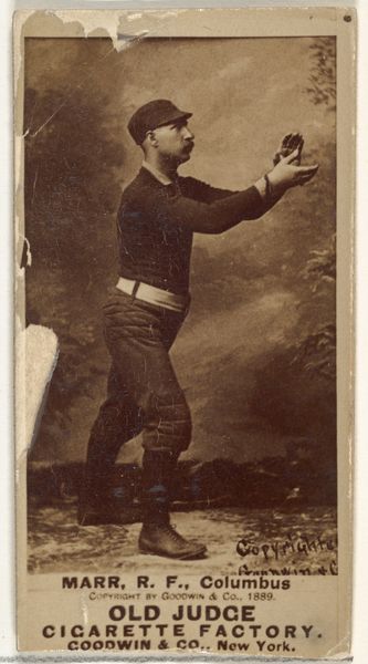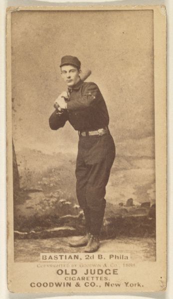 Curator: Let's delve into this intriguing card from the Old Judge series, featuring Paul Aloysius Hines. This gelatin silver print, dating back to 1887, captures a baseball player mid-action. What catches your eye about it? Editor: It’s amazing how modern it feels, considering the date. It also feels so…casual, even staged. Is there anything you find particularly noteworthy about the image? Curator: The real interest lies in the intersection of industry and leisure. This wasn’t just about documenting a sport. Goodwin & Company used these cards as inserts for Old Judge Cigarettes. It’s about commodification; Hines, a laborer on the field, is transformed into a consumable product, tied to the leisure habits of consumers and the expansion of mass production. Do you see that tension between the artistry and the commerce? Editor: Absolutely. It's fascinating to think about the material conditions of making and circulating this image – the silver, the gelatin, the printing presses, the tobacco industry – and how all of those things influence what we see here. Curator: Exactly. And what about the circulation of these cards? Think of the collectors, the trade networks…each card becoming a small piece of a larger economic and cultural exchange. Who had access to these images, and what did they signify within those social circles? Editor: That's a great point, to think about it as part of that network and who had the resources to access it and who didn’t. I initially thought about it simply as a snapshot of an athlete. Curator: It’s a lens through which we can examine labor, materiality, and consumption, blurring the lines between art, advertisement, and everyday life. Editor: I'll definitely look at these kinds of images with new eyes from now on, considering the deeper connections between art, industry, and consumption. Curator: A new appreciation for materiality changes everything, doesn’t it?