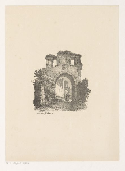 Curator: This engraving, titled "Gezicht door een poort van de ruïne van Burcht Rheinfels," roughly translated as "View through a Gate of the Rheinfels Castle Ruins," was created by Cornelia Christina Johanna van Trigt-Hoevenaar between 1864 and 1909. Editor: It’s evocative. There's something quietly haunting in its monochrome palette and stark presentation. The arch acts as a frame, inviting the eye, guiding your gaze toward an equally eroded structure deeper within. Curator: Absolutely. Van Trigt-Hoevenaar invites us into a reflection on history, and the passage of time as revealed by the enduring symbolism of architectural remnants. Notice how the solidity of the stone contrasts against the soft, blurry backgrounds—there's a conversation about weight and absence. Editor: The material composition enhances this, too. It's all paper and ink, of course, but she uses these delicate materials to present such hulking architectural form. The engraving itself lends this incredible detail— the artist exploits chiaroscuro in interesting ways, adding both visual intrigue and a somber note. Curator: The castle ruin is presented as more than mere stones. Instead, the enduring symbol of a stronghold evokes memories of bygone power and societal evolution. Observe the way nature intertwines with the structure. Editor: This is interesting! Look at the light within the ruin. While nature appears to reclaim this edifice, it does not eclipse it. What persists from this "bygone power?" The artist’s attention is not necessarily given to what’s crumbling, but rather, what stands defiantly despite its present decay. Curator: The piece speaks, doesn't it, to the cyclical nature of civilisations, the ebb and flow of power, all represented in enduring forms? The past resonates even amidst destruction, inviting reflection. Editor: It’s definitely a thought-provoking interplay between strength and fragility. Thanks for pointing out all the cultural memories within the architectural shapes—it adds new dimensions to an otherwise haunting piece.