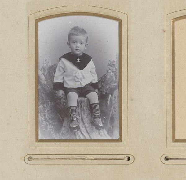 Curator: This is a fascinating photographic work, potentially created between 1902 and 1909 by Johannes Gesterkamp Jr. It's titled "Portret van een kind in witte jurk en een jongen in matrozenpak, aangeduid als Nico en Kees," which translates to "Portrait of a child in white dress and a boy in sailor suit, referred to as Nico and Kees". Editor: Well, immediately, I'm drawn in. It’s more than just a portrait; there's a touch of melancholy that sort of hangs in the air, despite their sweet, youthful faces. Is it just me? Curator: Not at all. Genre paintings from this period, and indeed portraiture generally, were deeply enmeshed with the social and aspirational values of the middle classes. A formal portrait like this broadcasted a family's status, its adherence to particular dress codes, and perhaps more subtly, their vision for their children's future. Editor: That sailor suit… Talk about symbolic baggage! It’s like a miniature uniform promising some vague destiny of naval achievement! You wonder, what were they *really* like, beyond these carefully constructed facades? And do those serious eyes hint at something less sunny going on? Curator: Exactly. There’s the performative aspect inherent to portraiture. The subjects are staged, but photography captures an instant, ostensibly an unvarnished truth of that pose. The cultural context here matters greatly; sailor suits were very popular for boys at this time, almost a uniform across Europe. Editor: It's funny how an ostensibly neutral snapshot of kids can open a Pandora's box of questions about everything from childcare practices to imperial ambitions! Looking again, I'm getting a flicker of vulnerability. Maybe it’s the lighting. Curator: The choice of monochrome really enhances the impact, and the clothing highlights class differences of that time. The contrast between the simple, functional sailor suit and what appears to be quite ornate dress emphasizes economic divisions but within one shared moment. Editor: I see the appeal. One photograph, many layers, many stories whispering just under the surface. A poignant artifact. Curator: Absolutely. This image connects the lives of individuals with broader historical trends and political realities of early 20th-century Europe.