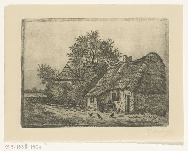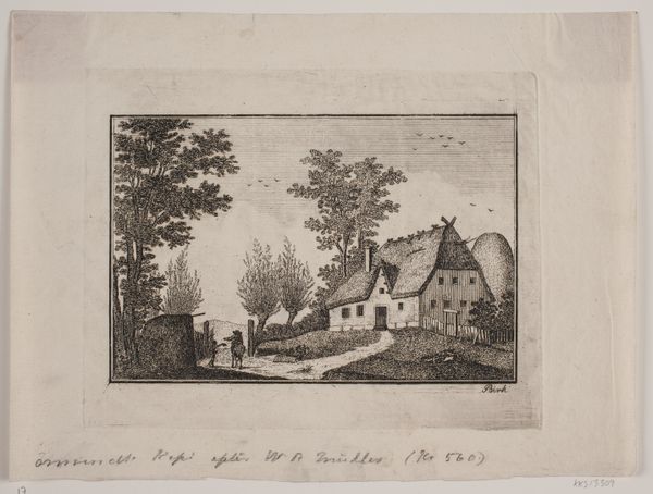 Editor: Here we have Matthäus Merian’s “Village Scene with a Cow and Goats,” created around 1620 using etching and engraving techniques. The tiny lines are mesmerizing! It's hard to believe this whole scene comes from a print. I immediately think of a simpler time, maybe because of the farm animals just hanging out in the road. What catches your eye in this piece? Curator: Ah, yes, a quiet snapshot from the Dutch Golden Age! You know, what really grabs me is the light. Notice how Merian uses those fine lines to create depth, almost as if the sun is just breaking through the clouds. I wonder, when you look at this image, does it feel like a real place, or something more...constructed? Editor: I think it’s both, actually. It has a reality to it – the way the buildings are drawn, the little details on the animals. But there's something almost…perfectly arranged about it all, too. Like it’s an idealized version of village life. Curator: Precisely! That tension between reality and ideal is key. Merian wasn’t just documenting; he was crafting a vision. A little stage play of rural tranquility. Can you almost hear the lowing of the cow, maybe the faint bleating of the goats? It’s a reminder that art isn't always about grand pronouncements. Sometimes it’s about capturing the poetry of everyday life, wouldn’t you agree? Editor: Definitely. I hadn't really thought about the “sound” of it before, but now that you mention it, I can almost hear it. It’s funny how one little print can open up such a big world. Thanks for sharing that! Curator: My pleasure! These small windows into the past… they’re gifts, aren't they? Reminders that even centuries later, we can still find connection and resonance in the simplest scenes.