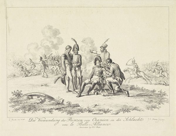 Curator: Here we have Daniel Nikolaus Chodowiecki's 1776 engraving, "Hoe een eerlijk man zijn straf incasseert," which translates to "How an honest man receives his punishment." It's currently held in the Rijksmuseum collection. Editor: The overall mood strikes me as quietly devastating. The precise lines capture a moment of undeniable humiliation. The composition is stark. It is drawing the viewers' attention towards this isolated exchange. Curator: Note the precision of Chodowiecki's etching technique. The delicate lines, built up through meticulous cross-hatching, define the figures and their environment. We can discern the textures of their clothing and the subtle contours of the landscape through these marks. Editor: Indeed, the technique itself is compelling. However, what stands out to me is how Chodowiecki uses this formal precision to depict a very specific societal ill – the public shaming of an individual by state-sanctioned authority. This echoes the political climate of the late 18th century. Curator: We might also read the figures symbolically. Consider the upright posture of the punished man. Notice that he still exudes a sense of dignity, contrasting the aggression shown by the figure with the raised sword. There's a palpable tension between order and resistance rendered beautifully by the line work. Editor: And this tension, of course, plays into the larger narrative of power, social control, and the individual. The man's "honesty," as the title suggests, directly challenges those structures. The crowd of onlookers further amplifies this dynamic, becoming silent witnesses, accomplices in his degradation. Curator: It is quite remarkable how such a small print – just a few inches in either dimension – can encapsulate such weighty themes with such precision. It is the balance of visual elements, its contrasts of dark and light, form, and posture, that lend it a profound sense of consequence. Editor: Absolutely, and that very conciseness makes the image deeply unsettling. We’re left pondering how societal norms and the machinery of justice intersect to create these moments of public cruelty. There's a dark message in its artistry. Curator: Agreed. A haunting distillation of power and its effects, expertly rendered in line and form. Editor: It speaks volumes, especially considering its place within historical debates on liberty and injustice. A piece that deserves a slow and attentive viewing.
