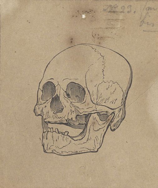 Editor: This pencil drawing, “Skull” by Otto Scholderer, from the Städel Museum's collection, strikes me as both simple and profound. It’s stark, almost minimalist in its presentation. What do you see in this piece? Curator: I see more than just a memento mori; I see a critique of power structures. Skulls, historically, are symbols of mortality, yes, but mortality is not a great leveller. Consider how death differentially impacts marginalized communities, often as a result of systemic oppression and violence. Editor: So, you're saying it's not just about everyone dying eventually? Curator: Exactly. Whose deaths are mourned, whose are ignored, whose deaths are actively caused by social injustice? This skull, divorced from its body, becomes a blank canvas. We can project onto it questions about whose stories get told and remembered, and whose are erased. Does the artist acknowledge these inequities, or unwittingly perpetuate them? Editor: That’s a pretty heavy reading of a seemingly simple sketch. Does the medium—graphite on paper—play into that at all? Curator: Absolutely. The fragility of the medium underscores the precariousness of life, but also the ease with which narratives can be erased or rewritten. The "sketchiness" also reflects how some histories remain unfinished or inadequately rendered in art or official accounts. This becomes another facet of mortality— historical as well as individual. Editor: That makes me think about the incompleteness of archives and whose stories end up missing. Thanks, I didn't expect to view a simple skull through such a complex lens. Curator: And hopefully that reframing pushes one to reflect on how our perceptions of art are shaped by and can, in turn, reshape societal power dynamics.