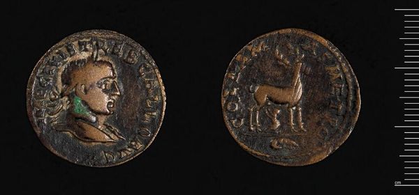 Curator: Before us is a diobol of Alexandria, dating back to the reign of Antoninus Pius. It's a humble coin, isn’t it? Editor: It has a certain weight about it, literally and figuratively. I'm immediately drawn to the material, the copper alloy, and the marks of wear. It speaks to its journey through countless hands. Curator: Indeed. On one side, we see the idealized portrait of Antoninus Pius, a symbol of imperial power and authority. On the other, the sacred bull Apis, a deity revered in ancient Egypt for its virility and connection to royalty. Editor: These coins acted as a form of mass production, spreading the emperor’s image and power across a wide range of social classes. The very act of minting these coins solidified the emperor's control over resources and trade. Curator: Absolutely. The Apis bull isn't simply a decorative element; it represents the enduring strength and divine favor associated with the emperor's reign. Editor: I find myself pondering the hands that labored to mine the metal, strike the die, and circulate this coin. Such a small object carries such a large social context. Curator: It's a reminder that even the smallest artifacts can hold profound meaning. Editor: Quite so, the means of production and iconography are so intertwined, it’s easy to get lost in history.