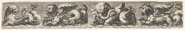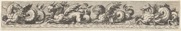 This intriguing frieze, depicting a sphinx with a fish tail on the left, was made by an anonymous artist using the graphic technique of etching. The fine, precise lines suggest the use of a sharp tool, likely a needle, to incise an image into a coated metal plate. Acid would then have bitten into the exposed lines, allowing for ink to be held and transferred onto paper. The material qualities of the metal plate and the artist's skillful manipulation of the etching process have resulted in an image with incredible detail. Consider how the process of etching, with its reliance on careful handwork and chemical reactions, reflects a time of both craft production and burgeoning scientific exploration. The very act of printing allowed for these images to be widely distributed, fueling a growing culture of visual communication, commerce, and collecting. So, next time you look at a print, think about its full meaning, and challenge the established definitions of art and craft.