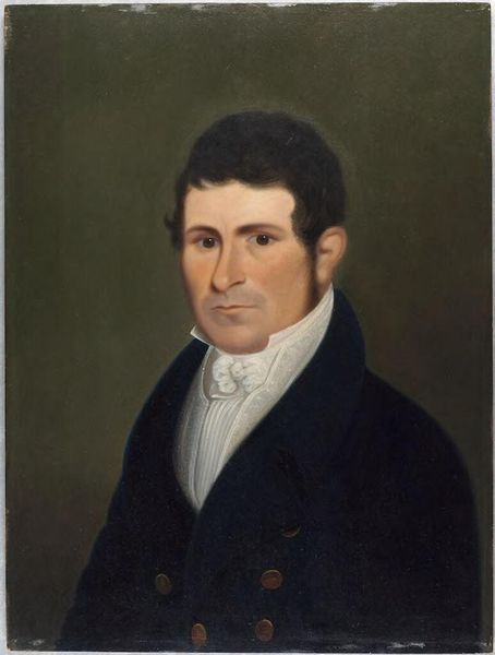 Curator: This is "Man with Vial," painted around 1827 by Erastus Salisbury Field. It's an oil portrait. Editor: He looks... uncertain. There’s a solemnity to him, a touch of melancholy, almost like he's anticipating a difficult decision. The vial adds to that tension; what’s inside, a cure or a curse? Curator: It’s interesting that you picked up on the tension, as the role of science and medicine was evolving rapidly in the early 19th century. Field likely captured something of the anxieties of that era, with the vial serving as a potent symbol of both hope and potential harm. It may also reflect a cultural fascination at the time. Editor: Yes! Absolutely! The theatrical quality, the dramatic light, makes it feel less like a straightforward likeness and more like an allegorical representation, perhaps about mortality, scientific innovation, and all the promises and perils of the future. Is it fair to call the piece both scientific and humanistic? Curator: Absolutely. Field's work sits in a space where artistic and scientific ideas intersect. What does the formal language—the controlled brushstrokes, the calculated lighting—tell you? Editor: There's a very rigid posture and reserved expression that create distance, but I can feel his emotion because his fingers grasp that vial! He clings to something that looks helpful but could kill. Curator: Precisely. The academic influences, rendered here in a naive, unschooled style, are quite potent when paired with that intimate intensity you pointed out. The piece operates on so many levels. Editor: I find it fascinating to consider the audience and how perceptions of health have changed, too, since its first reveal. I imagine our twenty-first-century eyes pick up an entirely different feeling than early viewers did. This vial could very well signify that point in our world’s trajectory. What an enduring question—hope or peril? Curator: It makes you wonder who this man was and the true purpose of the vial in his possession! Editor: Right, some questions are better left for us to feel and keep, like the pulse in his hand!