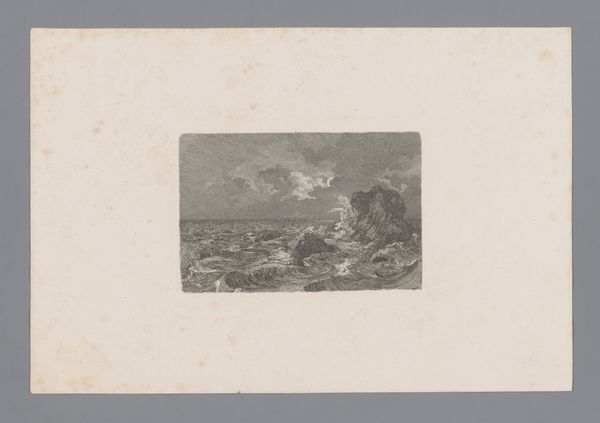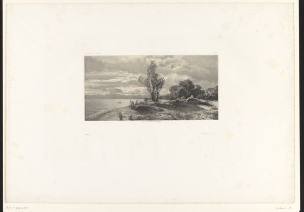 Curator: Well, here we are looking at Henri Rul's "Landschap met boerderij in maanlicht"—Landscape with farm in moonlight. This etching, dating sometime between 1872 and 1913, has such a stark beauty. Editor: Yes, bleak beauty for sure. It reminds me of a stage set, all dark shapes and a slightly sinister spotlight of a moon. It feels both familiar and unsettlingly remote. Curator: Remote is a great word for it. Rul masterfully uses the etching technique to capture a raw and desolate scene. Look at the fine lines, the subtle gradations creating a sense of depth. He really leans into the darkness, you know? Editor: And I think that darkness, that embrace of shadow, becomes really relevant when we consider the social climate of the late 19th century. Realism often presented unvarnished portrayals of rural life and labor—a perspective largely unseen. Curator: Absolutely! It speaks to a shift in artistic consciousness, a rejection of idealized landscapes for something grittier. The silhouette of the farmhouse isn’t picturesque, it’s simply there, under that stark, judging moonlight. Editor: I think you're spot on. And in many ways, the moon here acts as the perfect symbolic vehicle for enlightenment, because the light shines equally over a home but it obscures equally too. This highlights this contrast in representation. Curator: Exactly. This little print, this snapshot of moonlight on a farm, isn't just about the scene itself but also the stories and questions it silently evokes. Editor: It’s true. There’s an unresolvable tension there. Is it comfort, hardship, or a mixture of the two that radiates from the scene? Curator: It makes you wonder about the lives lived inside. All those ordinary stories, unfolding under an extraordinary moon. I hadn't thought about the tension aspect of this work; that tension definitely draws me in. Editor: Glad to offer some fresh perspective on it. Curator: Me too, truly a gem that reflects upon its moment.