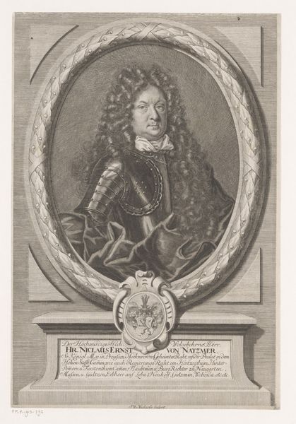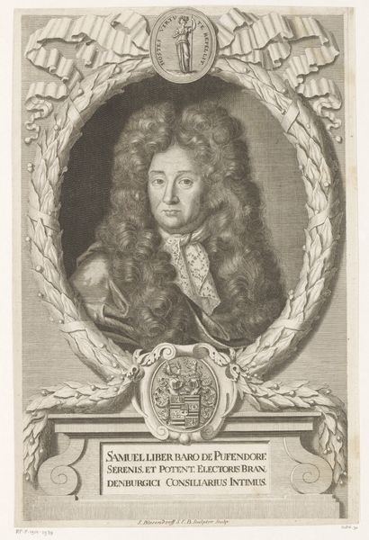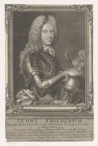 This is Christoph Weigel's portrait of Frederik IV, King of Denmark and Norway, made sometime between 1654 and 1725. It's an engraving, a medium that democratized images in this period. The portrait offers a window into the politics of identity. Frederik is framed by his royal titles, literally inscribed around him, asserting his power. Yet, it's his powdered wig, elaborate garment, and the symbols of royalty at the base that speak volumes about constructed identity. These aren't just markers of status; they're performative acts solidifying his position within a rigid social hierarchy. The gaze is cool, calculated, and every element seems designed to evoke awe and obedience. Weigel’s engraving reminds us that identity, especially for those in power, is a carefully constructed performance. It asks us to consider who is invited into these constructions, and who is excluded.