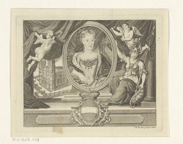 This is Johann Georg Mentzel’s “Portret van Magdalena Sibylla Schacher”, made with etching. The composition is structured around the central portrait bust of Magdalena, flanked by allegorical figures and heraldic symbols, creating a symmetrical, balanced tableau. The artist uses line and form to convey status and virtue. The intricate detailing in the drapery, the rendering of the figures' garments, and the heraldic crests indicate the sitter's noble standing. The allegorical figures positioned on either side of the portrait, along with the heraldic symbols, invite us to consider the values and attributes associated with Magdalena. The precise execution and formality suggest an interest in conveying the sitter's enduring legacy. The work invites analysis into how it functions as both a representation of an individual and as a constructed symbol of social and moral authority.