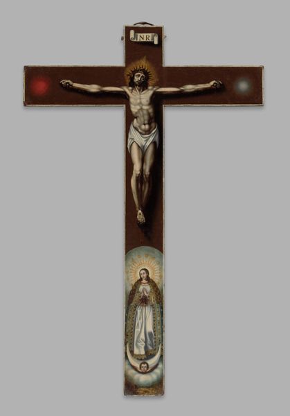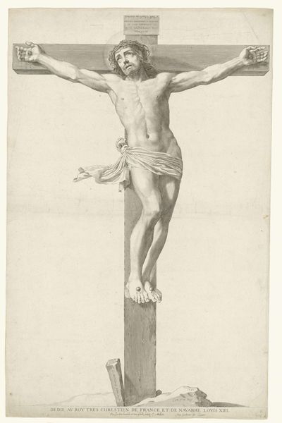 This is Alessandro Algardi’s "Christ on the Cross", an etching rendered in delicate lines on paper. The composition is dominated by the stark image of Christ suspended on the cross, set against a muted background. This contrast immediately captures the viewer's attention, focusing it on the central figure and his moment of suffering. The artist's strategic use of line and shading contributes to the emotional depth of the work. The fine, precise lines define Christ's anatomy and the rough texture of the wooden cross, while the varied shading conveys a sense of volume and depth. The figure seems to emerge from the background, enhancing its dramatic presence. Algardi uses semiotic codes to intensify the drawing's cultural and philosophical context. The image of crucifixion, a signifier of sacrifice and redemption, invites viewers to reflect on themes of faith, suffering, and salvation. The etching's formal qualities serve not only aesthetic but also symbolic purposes, engaging in a broader cultural discourse about mortality and spirituality. As such, the artwork encourages continuous interpretation and re-evaluation of its meaning.