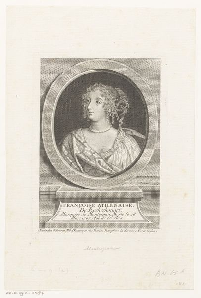 Curator: Before us hangs Wenceslaus Hollar's engraving, “Portrait of Vittoria Colonna,” created between 1650 and 1651. It's currently held in the collection of the Rijksmuseum. Editor: It projects a solemn air. The subject gazes off to the side, and the hatching lines used to create shadows amplify a somber mood. The lack of color seems significant, stripping away a certain vibrancy. Curator: Hollar, primarily known for his topographical prints and detailed cityscapes, here renders the renowned Italian noblewoman and poet. The work testifies to the increasing popularity of portrait prints, which made art and likeness accessible to a broader public. Note Hollar's careful delineation of the fabrics and the detailed texture given to Colonna's hair. Editor: The composition itself is intriguing. The slightly elevated viewpoint and the sharp angle of the light emphasize the textures, and the geometry gives it balance. Notice how Colonna holds what appears to be an antique lamp. What statement does that add? Curator: It's a potent symbol! As a widow, Vittoria Colonna dedicated herself to intellectual pursuits and spiritual reflection. The lamp here could represent both enlightenment through learning and a guiding light during a period of personal darkness. Editor: Placing the portrait in its historical context of dissemination, prints like this functioned as an early form of visual media, circulating images of notable figures beyond the elite circles who commissioned painted portraits. But I can't ignore that the depiction has some flatness to it—it’s accurate in form, yet limited. Curator: Engravings operate within a vocabulary of line and tone, but even within that restraint, Hollar achieves considerable detail. His ability to suggest form through a sophisticated use of cross-hatching reveals the artist's technical mastery. Editor: Overall, this print does something important. By stripping away the overt artifice and color, we can look through to the core expression in Vittoria Colonna. Curator: Precisely! The constraints illuminate rather than limit.