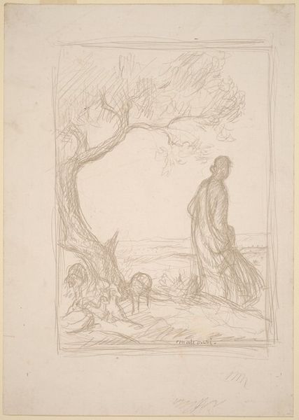 Editor: We’re looking at "Normandy," a pencil drawing from 1893 by Pierre Puvis de Chavannes. It's deceptively simple; it almost looks unfinished. What stands out to you in terms of composition? Curator: Note how the composition is built on a network of lines, seemingly arbitrary. Observe how some of these lines coalesce to form a figure, and a foreground that dissolves gradually toward the background, defying conventional depth. Does the receding perspective contribute to a flattened picture plane? Editor: Yes, it almost feels like a tapestry! The figure, though, she’s very classical in her pose. Is that intentional, and what purpose does it serve? Curator: Consider the interplay of line and form within the academic framework. The rendering of the female figure embodies classical ideals, yet is intentionally softened, eschewing rigid definitions for fluid lines. Does this aesthetic language evoke a tension, or a fusion, between traditional forms and emerging modern sensibilities? Editor: I think I see what you mean; it's familiar, yet distorted just enough to be unsettling. The pastoral scene is disrupted by its own artificiality, almost. Curator: Precisely. We see here a manipulation of form that calls into question the relationship between representation and abstraction. Notice also the cow at the bottom? Are we able to view it distinctly, or is it simply lines indicating the presence of the bovine form? The lack of solidity, as a structural decision, creates spatial ambiguity and ultimately enhances its artistic presence. Editor: So, it’s not just a drawing of a woman in a landscape, but an exploration of how we perceive form and space itself. That’s fascinating. Curator: Indeed. By attending to the formal elements of this work, we may begin to unpack its complexity and question assumptions around mimetic representation. Editor: This close looking makes me appreciate the layers of intention, even within what seems like a quick sketch. Curator: Precisely, we can continue exploring Puvis de Chavannes’ work.