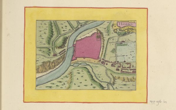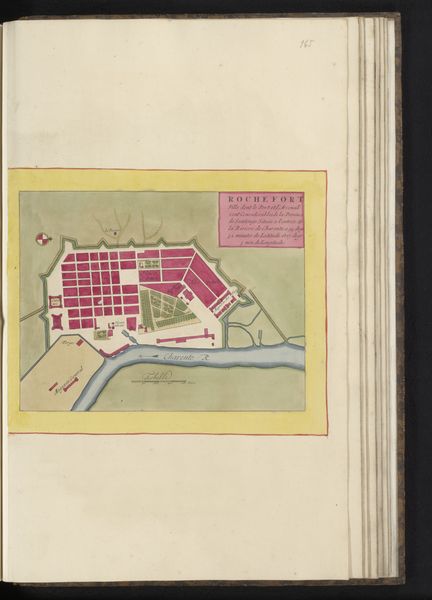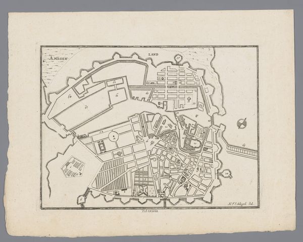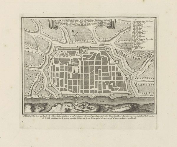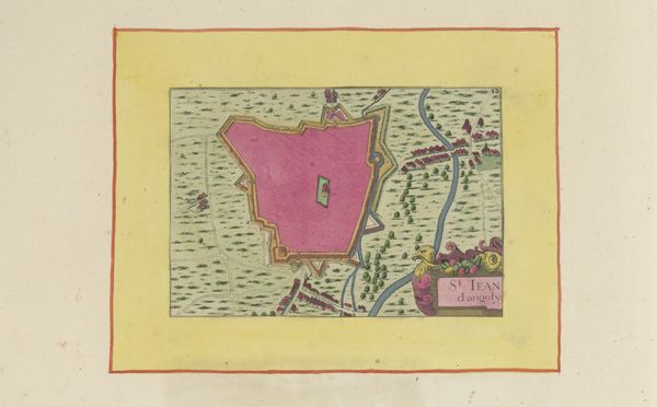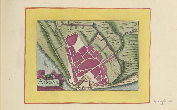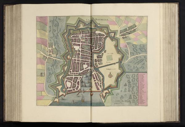 Curator: It looks a bit like a stained-glass window exploded onto a parchment. My eye immediately jumps to those vibrant pink blocks—is that the city itself? Editor: Indeed. Here we have "Kaart van Kythira," a map of Kythira, or Cerigo, as indicated at the bottom of the work. The artist, Willem Swidde, possibly created it between 1679 and 1717. It's a print, using ink on paper—an engraving. Curator: So, a visual representation aiming to distill geography, history, power dynamics, into this two-dimensional form. The strategic, planned layout jumps out; the geometric forms constrained within fortifications speak of a militarized approach to space. How does that interplay with the location’s history and culture? Editor: Well, I find it strangely soothing despite the fortified look you pointed out. Those little squares… they make me think of dollhouses all neatly arranged, though probably life within those walls was anything but doll-like, and probably filled with conflict, especially at a location which represented so many historical and economic trading routes in that particular slice of time. It really offers this simultaneous tension and tranquility. Curator: Absolutely, because when we analyze the geopolitical position of Kythira, strategically located for maritime trade routes and military control, the map functions as more than just a guide; it embodies colonial ambitions, trade dominance, and defensive strategies. How are the populations represented, or rather, omitted? Editor: It’s striking, isn’t it? You see this intricate depiction of space—walls, paths, little suggestion of elevation—but it's all so sterile. I think it is missing that organic energy of humans living and breathing. Although I notice those fine ink drawings which might offer little traces of human activity at the very borders of the island; still, these people are at best ghostly appearances! Curator: Right, and what does that erasure mean in the context of cartography during the Dutch Golden Age? Who was this map intended for? What narratives does it perpetuate or challenge regarding power, ownership, and the "other"? I keep asking myself: what kind of violence, power, race, and control does this visual order seek to legitimize, conceal, or normalize? Editor: Gosh, it’s fascinating to consider. So many possible answers locked inside this little geometric fortress! From my perspective as an artist I find the color choices surprising and somewhat arbitrary, though quite lovely, don’t you think? It somehow breathes an eccentric elegance onto those heavy fortifications! It takes quite an inventive touch to create something so both serious and playful. Curator: Indeed. "Kaart van Kythira" encourages us to think about the multiple layers of meaning embedded in seemingly objective representations. Editor: Definitely gives a lot to reflect on beyond just geographical information.