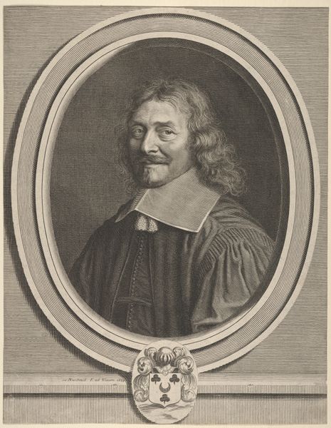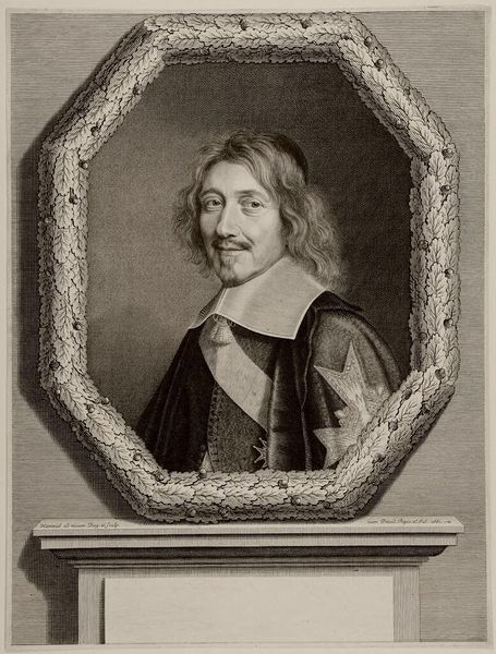 Curator: It's hard to not get a sense of gravity looking at this. The severe expression on his face framed with a formal arrangement… what's the story? Editor: What we have here is "Chancelier Michel IV Le Tellier", a portrait created by Robert Nanteuil in 1661. It is currently held at the Metropolitan Museum of Art in New York, crafted as an engraving, drypoint and burin on paper. Curator: I'm immediately struck by the artist's choice of framing. The laurel wreath feels almost…ominous. In contrast to the softer, almost playful rendering of the figure. Editor: Contextually, consider Le Tellier's role. He was Louis XIV's secretary of state for military affairs during a period of intense centralization of power. Nanteuil's print served a very specific purpose—the dissemination of a powerful man's image. Curator: Absolutely. And who sees themselves in this portrayal? What’s so interesting is that there are so many symbols of power displayed…I wonder if this portrait served as a reminder of established norms? Editor: The star on his cloak immediately conveys status. Also, look at how Nanteuil handled the texture of fabric – the lace, the heavy drape of his robe – it's a carefully constructed image of authority. Think about how portraits, as public displays, influenced fashion and social roles! Curator: Yes! And considering queer theory… were there constraints put on the identity of the person? This piece offers the chance to explore this idea of "ideal" presentation! It reminds us to investigate representation through these visual texts, these portraits. Editor: That’s interesting; thinking about it from that perspective provides insight into what visual signifiers were understood at the time, and what image the political machine aimed to portray and the portrait served its social purpose well into the next centuries. Curator: The print's meticulousness underscores Le Tellier's position and impact on shaping seventeenth-century France. It really does provide insight into the era. Editor: For me, what endures is understanding these images as constructed pieces. The Baroque loved grand spectacles.